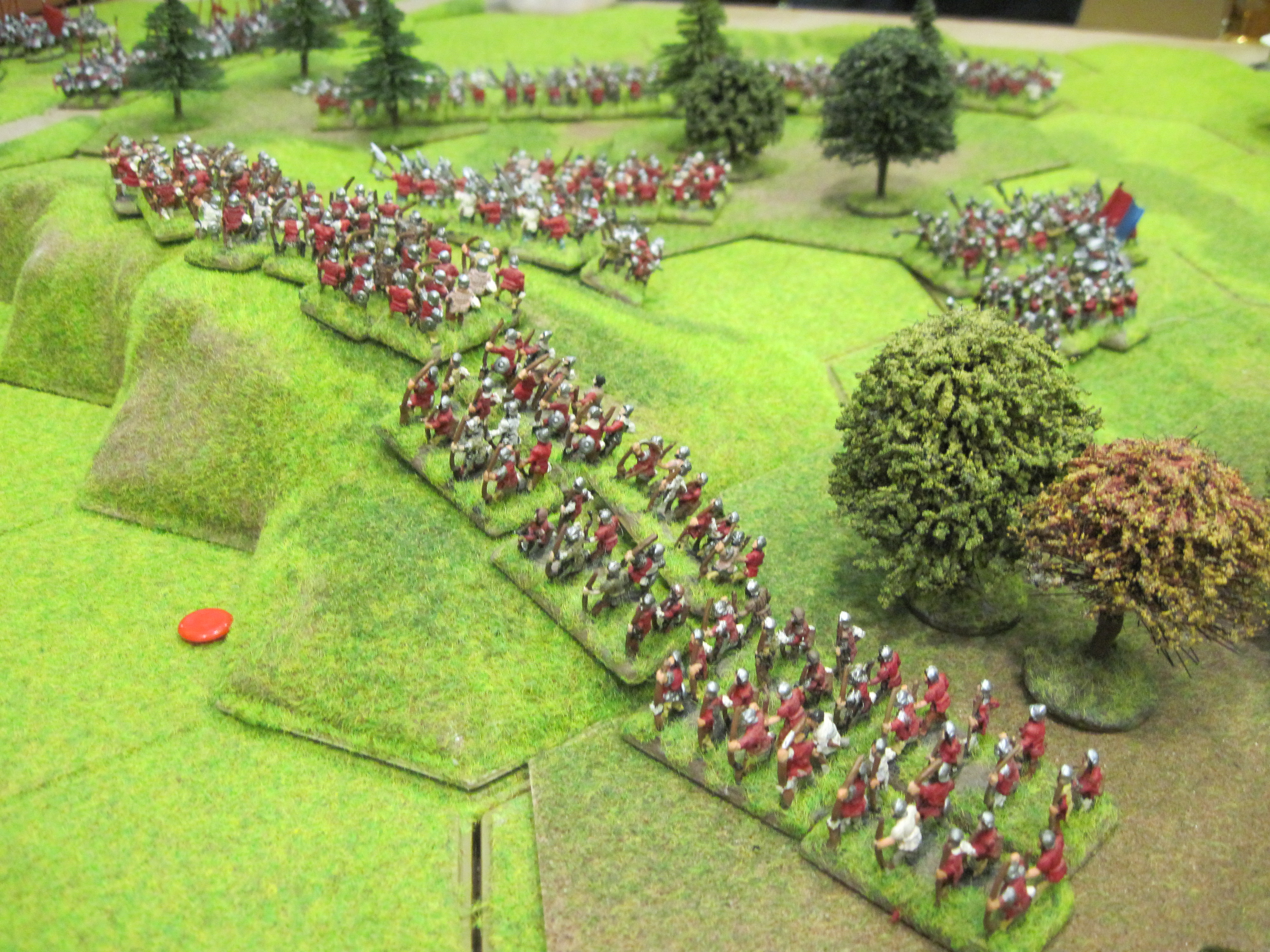 With three players on each side, all with different ideas on the best tactics with reference to the terrain and deployment, this was certainly a game of ‘generalship by committee!’ Both armies chose to deploy just about as far away from each other as the 6ft x 4ft table would allow. This resulted in the Yorkist army (in blue), which had fewer cavalry and was less mobile adopting a strong defensive line at a 45 degree angle across the table. This left the Lancastrians (red), advanced to occupy an 8 hex escarpment with its steep face directly facing the Yorkist defensive line.