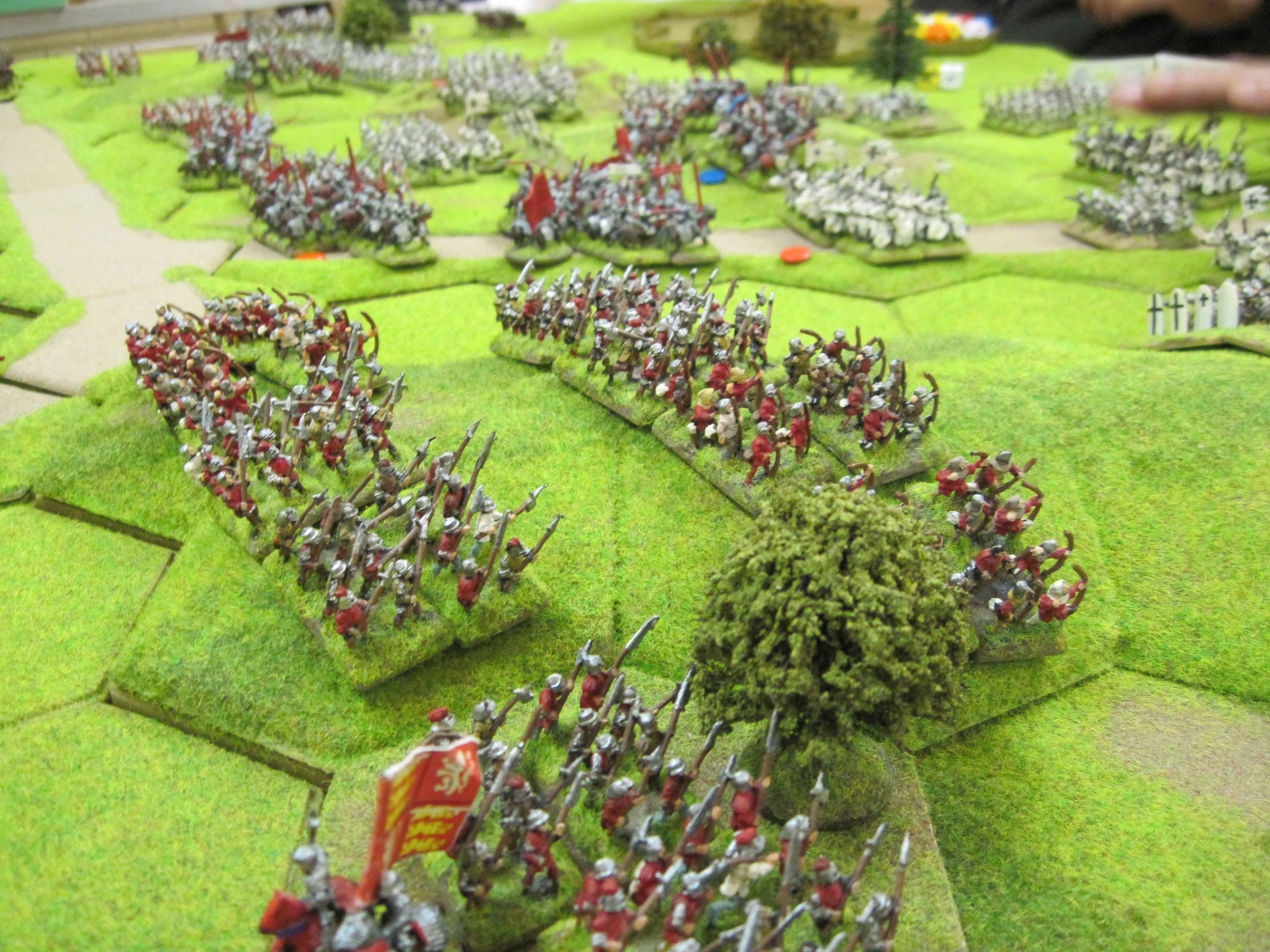 The charge heralded the commencement of hand-to-hand combat at various points along the closing lines. The Yorkist bill and longbow attacked the right of the Teutonic line where the mounted crossbow were unable to manoeuvre in restricted terrain. The billmen pushed these aside only to be stopped in the woods by very stubborn units of Teutonic spears. This was the start of an infantry struggle which was to last an hour!