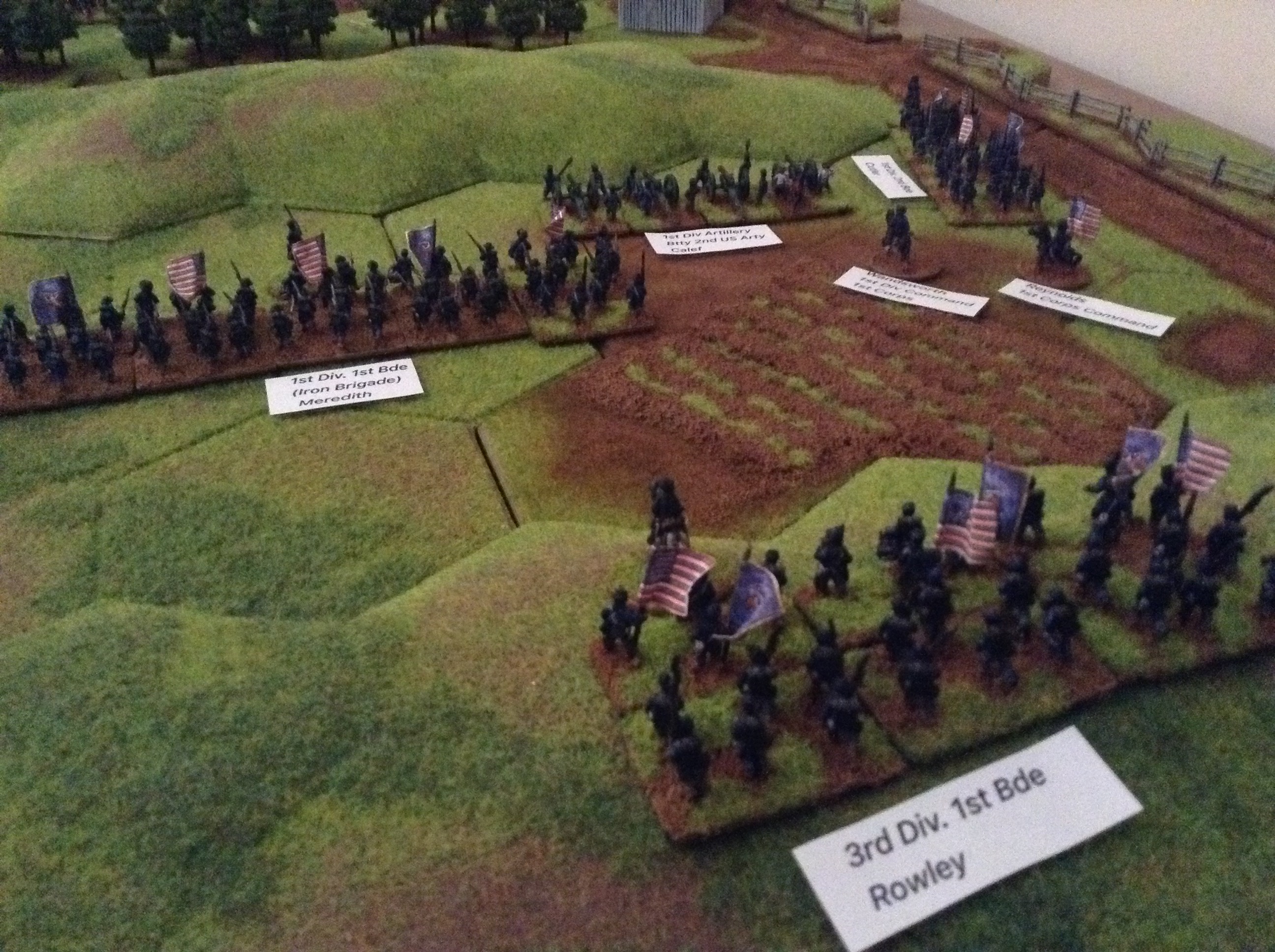 The various Brigades and Batteries were all represented as units and in addition to the main action of the Iron Brigade and the Confederate assault on McPherson ridge also added the fighting at McPherson Farm with Davis and Cutler engaging each other.