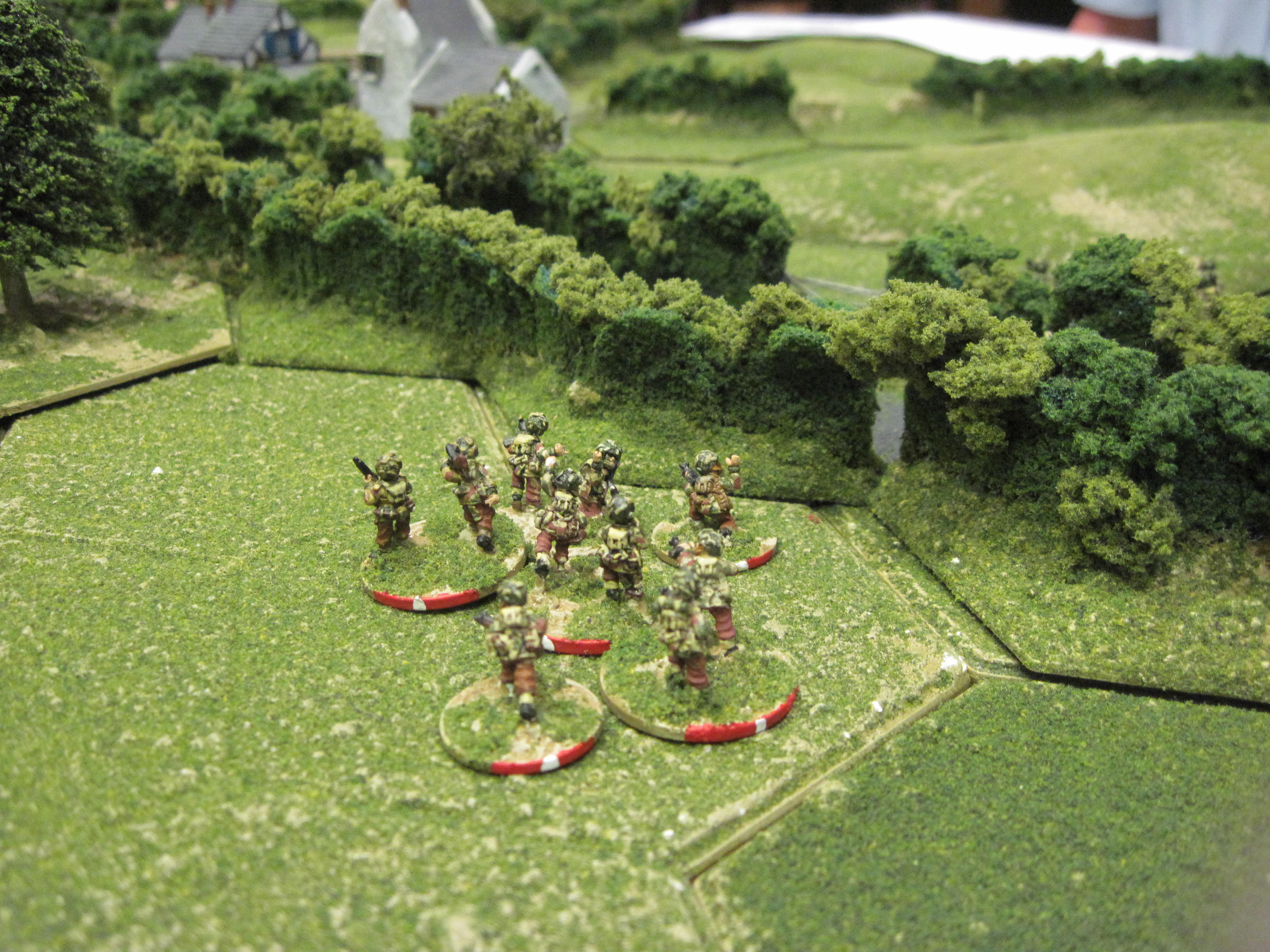 Opening moves saw a quick British advance and suppressive fire onto the hedge lined road separating the two hamlets. This resulted in one of German rifle sections located in the road being pinned, but also triggered the German reserves onto the table. One British section soon advanced to occupy the undefended hamlet on the left, while the German rifle section in the right-hand hamlet opened fire on the advancing British which were taking shelter behind a bocage hedge and small area of woodland. In this bocage terrain ‘spotting’ your opponents was the biggest challenge and so both sides were able to advance quickly towards each other because of the excellent cover of the hedgerows.
