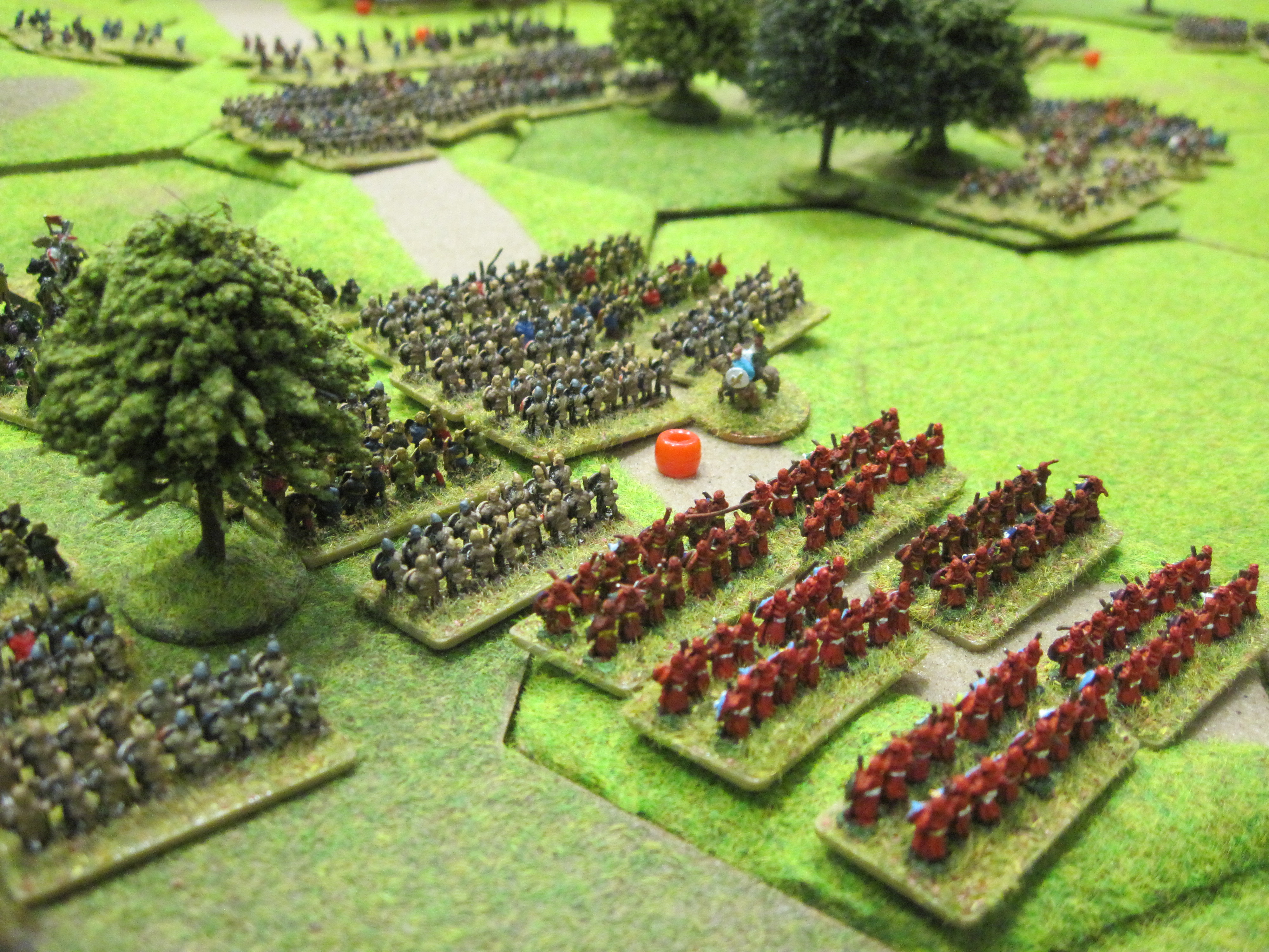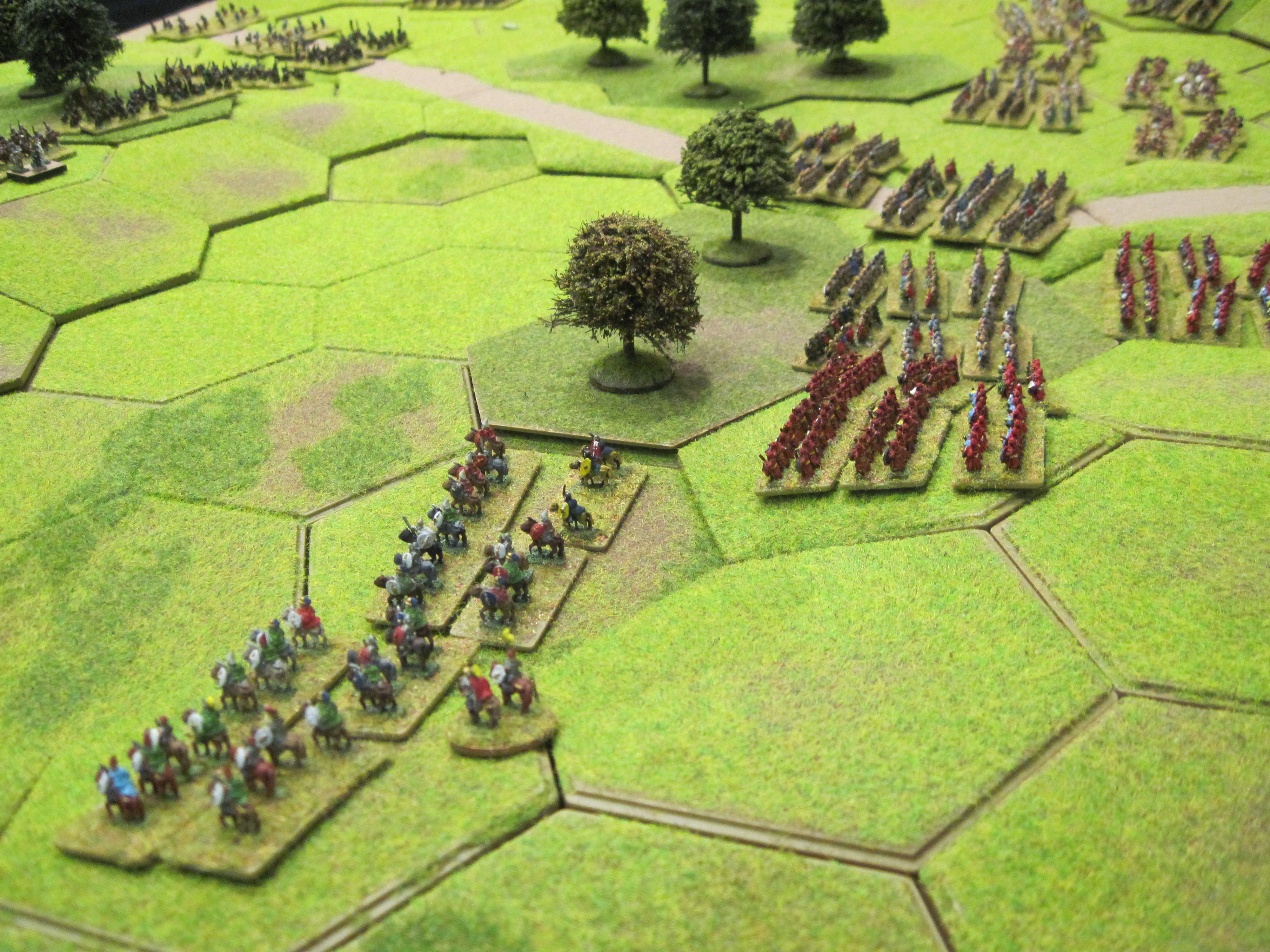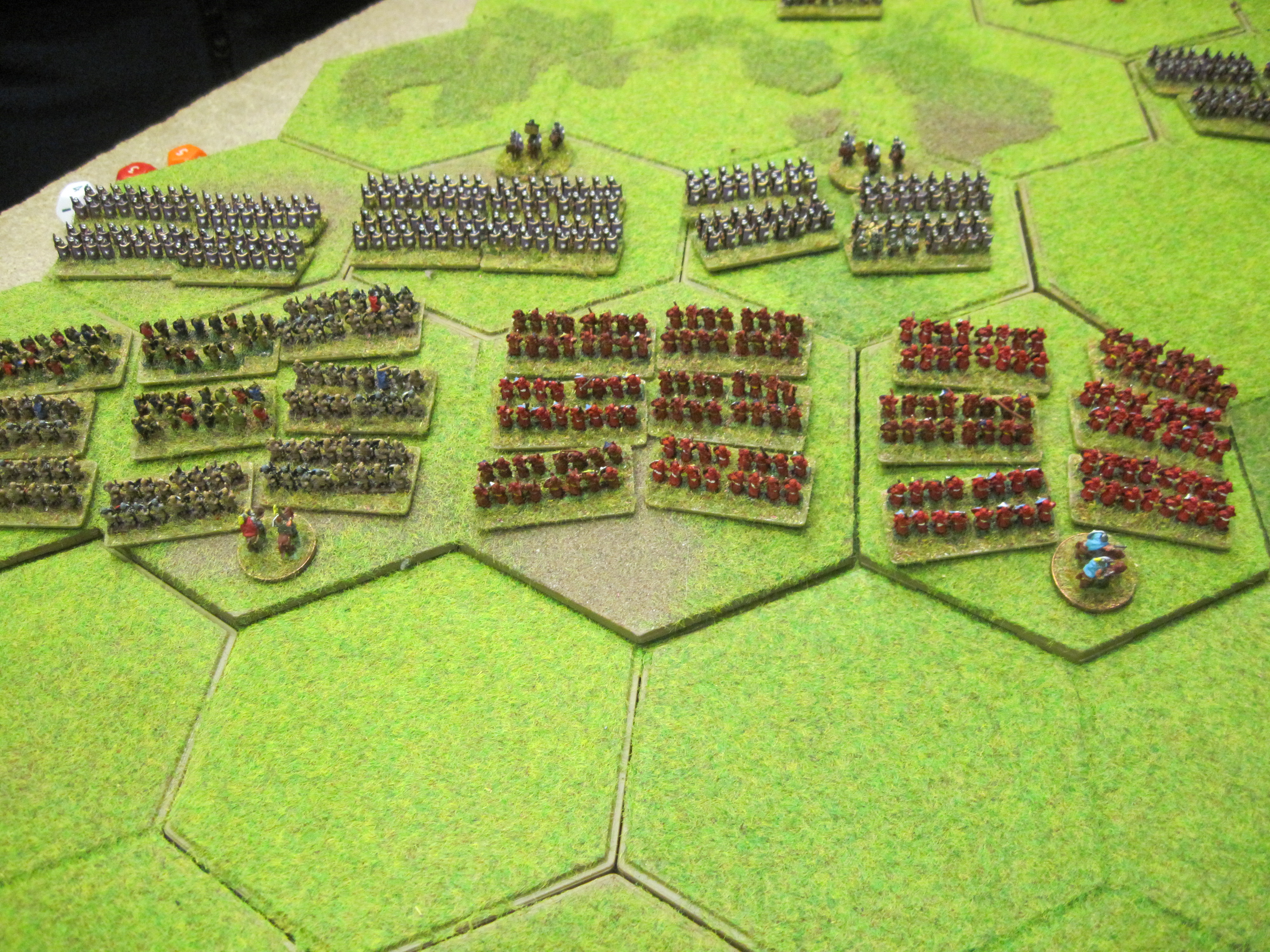 We Gallic commanders put our heads together and came up with a sort of plan; advance quickly and take control of the three areas of woodland, which would hopefully give our units a better chance against the Roman heavy infantry which could not voluntarily enter woodland hexes. Our quick moving 6 stand units of Gallic warriors soon gained ground on the Romans and we moved our 2 units of cavalry opposite their Roman counterparts.