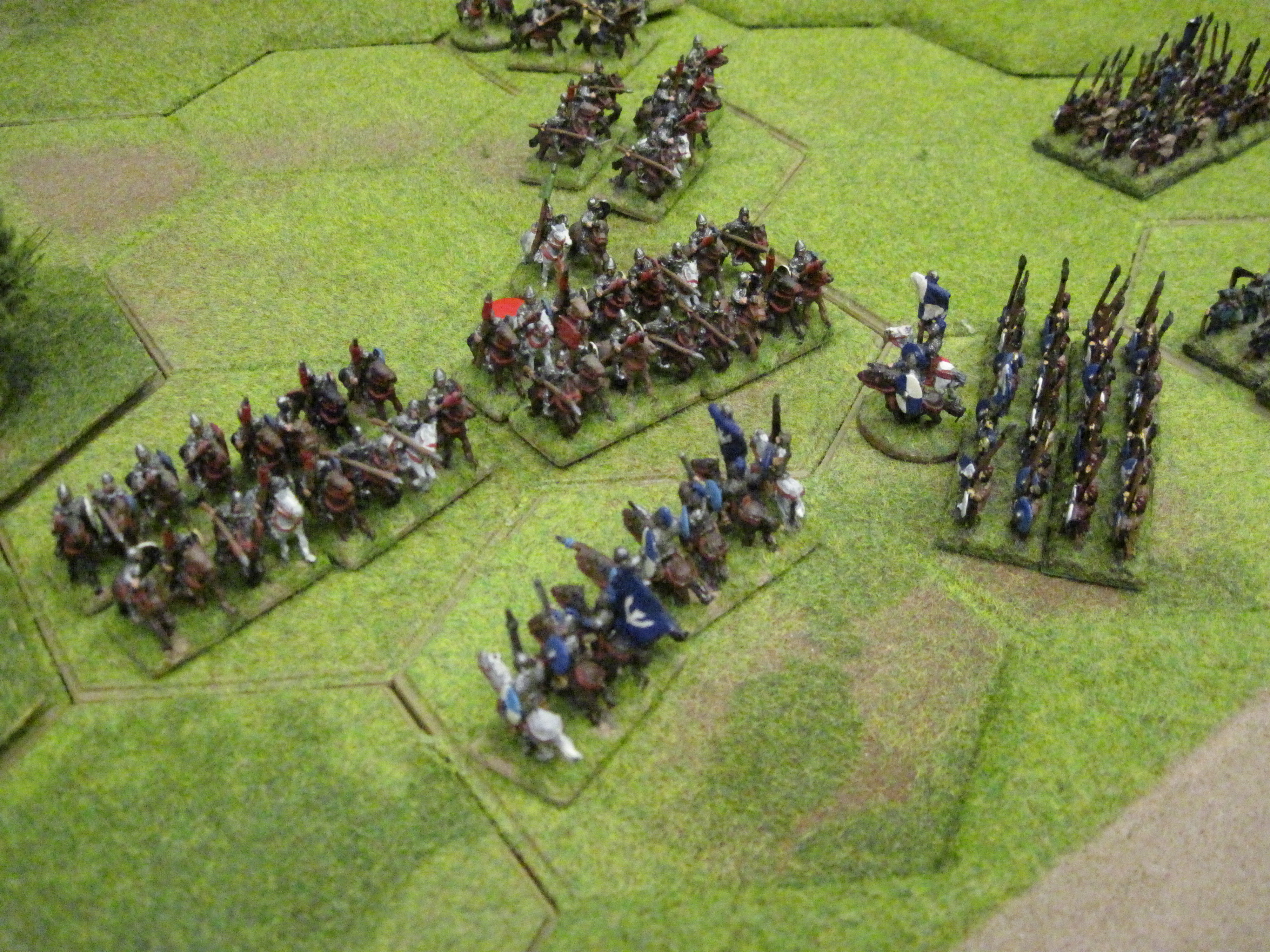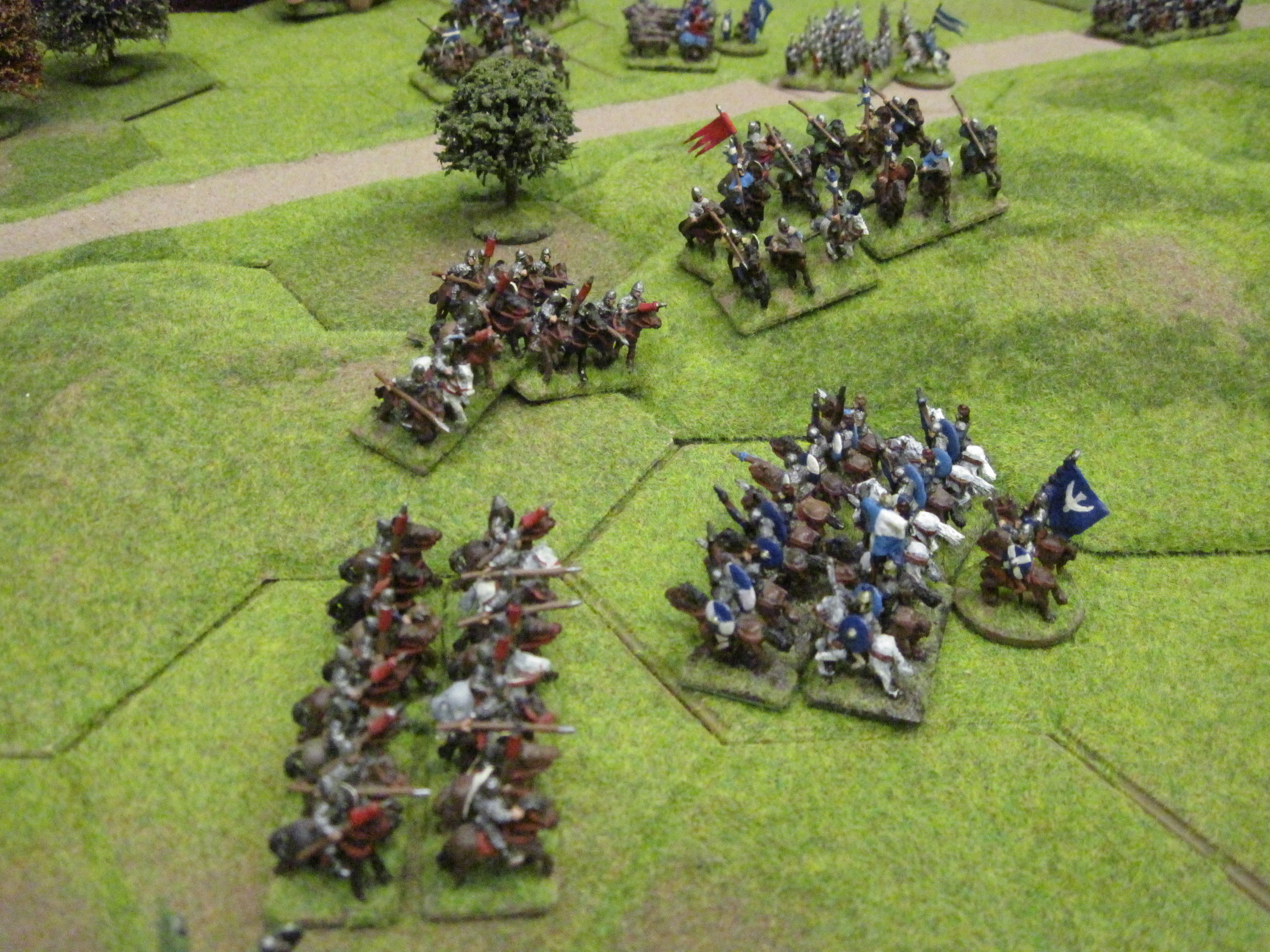 In the centre and left Chris had positioned his Chariots and cavalry ready to charge through our infantry lines against the lead units of Norman cavalry. Thankfully, Tony had held back his cavalry long enough for us to launch our attack and when we charged home the Norman cavalry lacked sufficient room to manoeuvre. We had committed 3 generals into hand-to-hand combat and so this was really a win or loose gamble. As things turned out we lost one general, but the recoiling back of Norman cavalry and infantry caused so much disruption that they were unable to counter-attack in the next Norman movement phase.