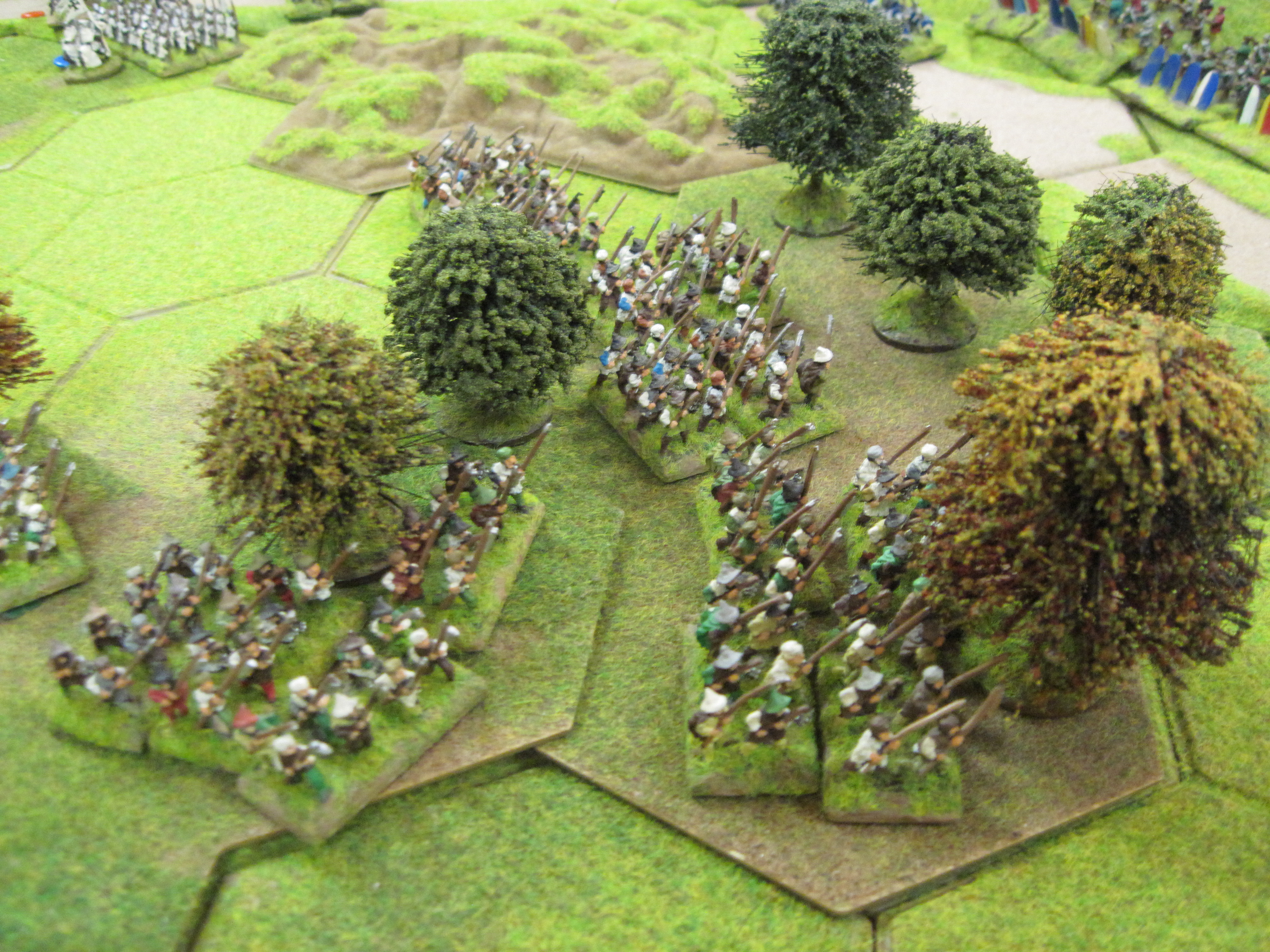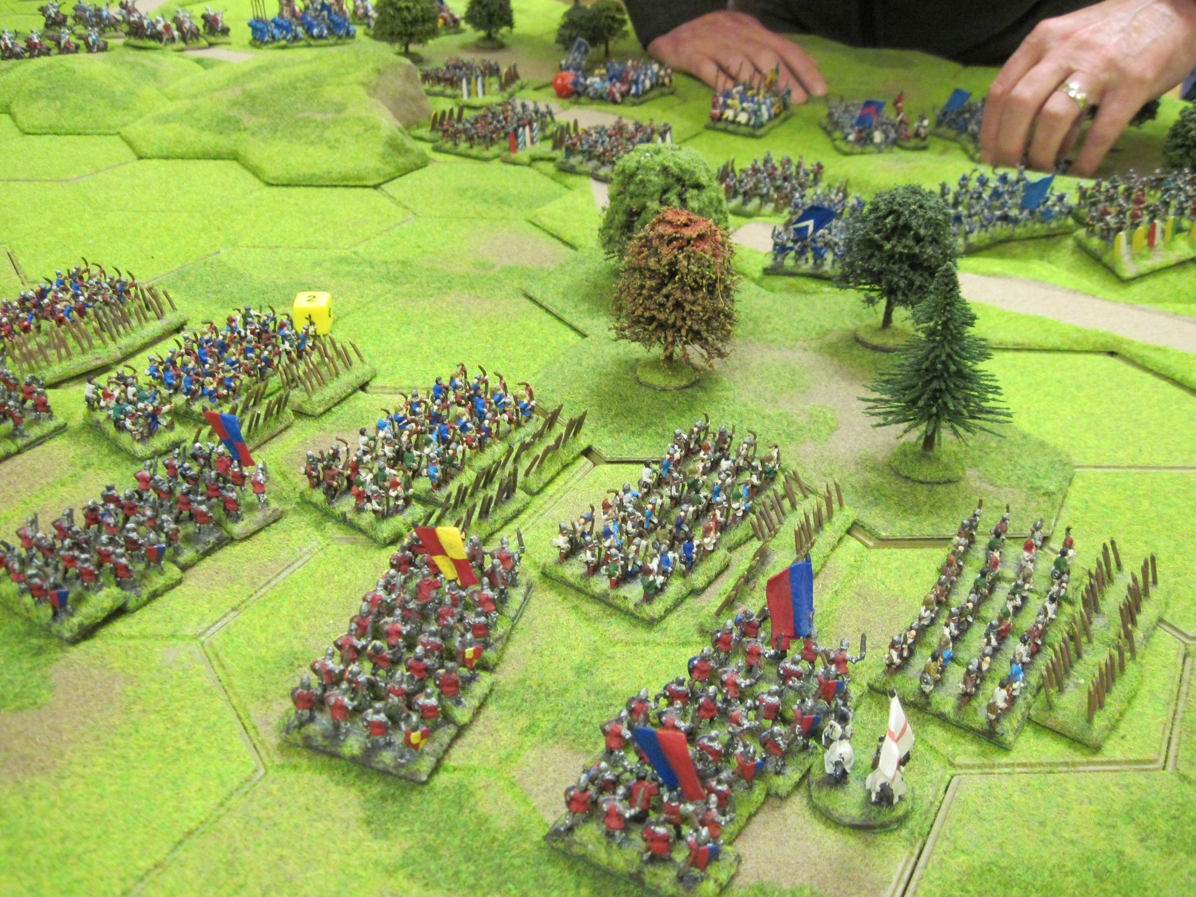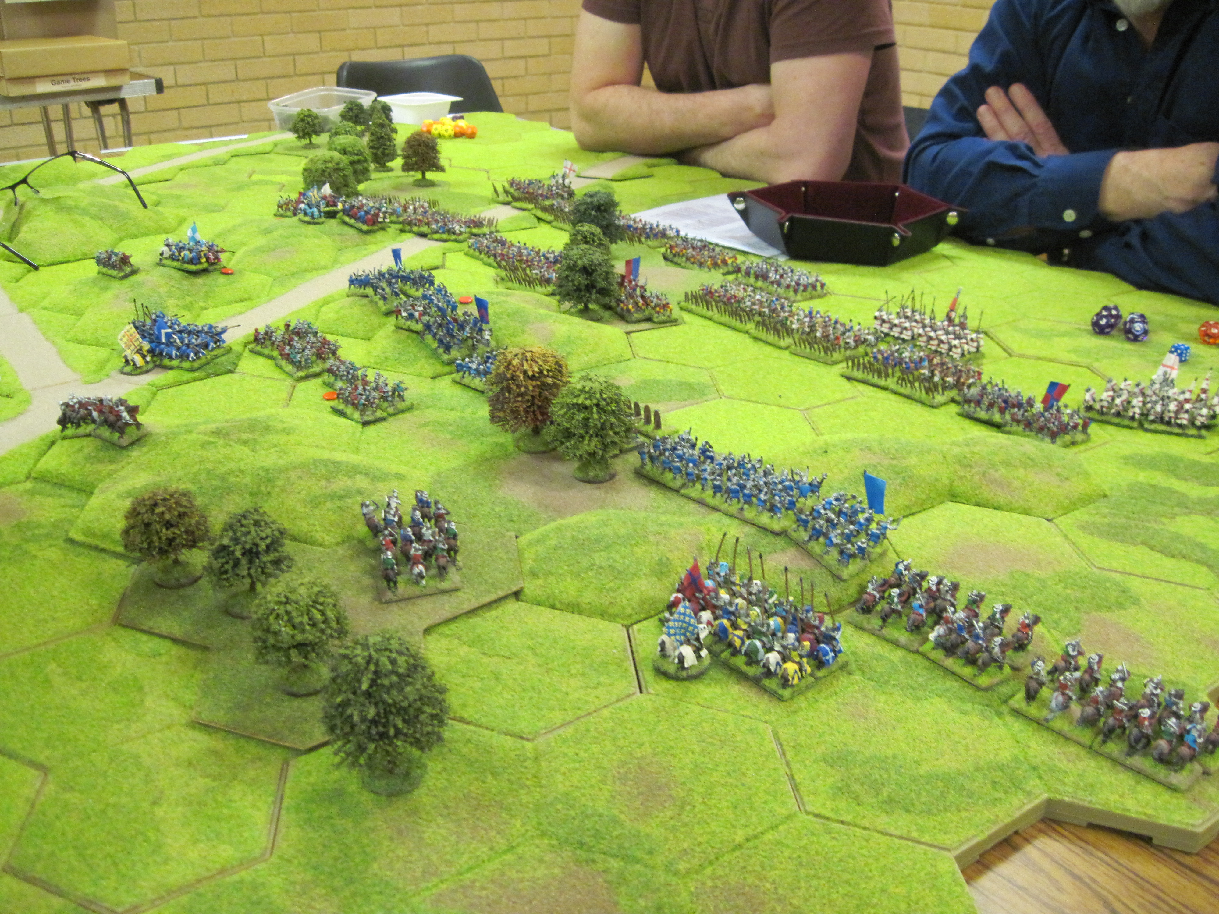 Chris and Steve won the di roll for choice of table edge and deployed their English longbow army across the width of the table making good use of the woodland areas to augment their strong defensive position. With the longbow deployed and ready behind their planted stakes they waited for Tony’s French onslaught to begin. With the English holding such a strong position Tony started his assault with infantry attacking through the woodland. Unfortunately, initial success was greeted by a hail of arrows from the English longbow shooting with commendable accuracy.