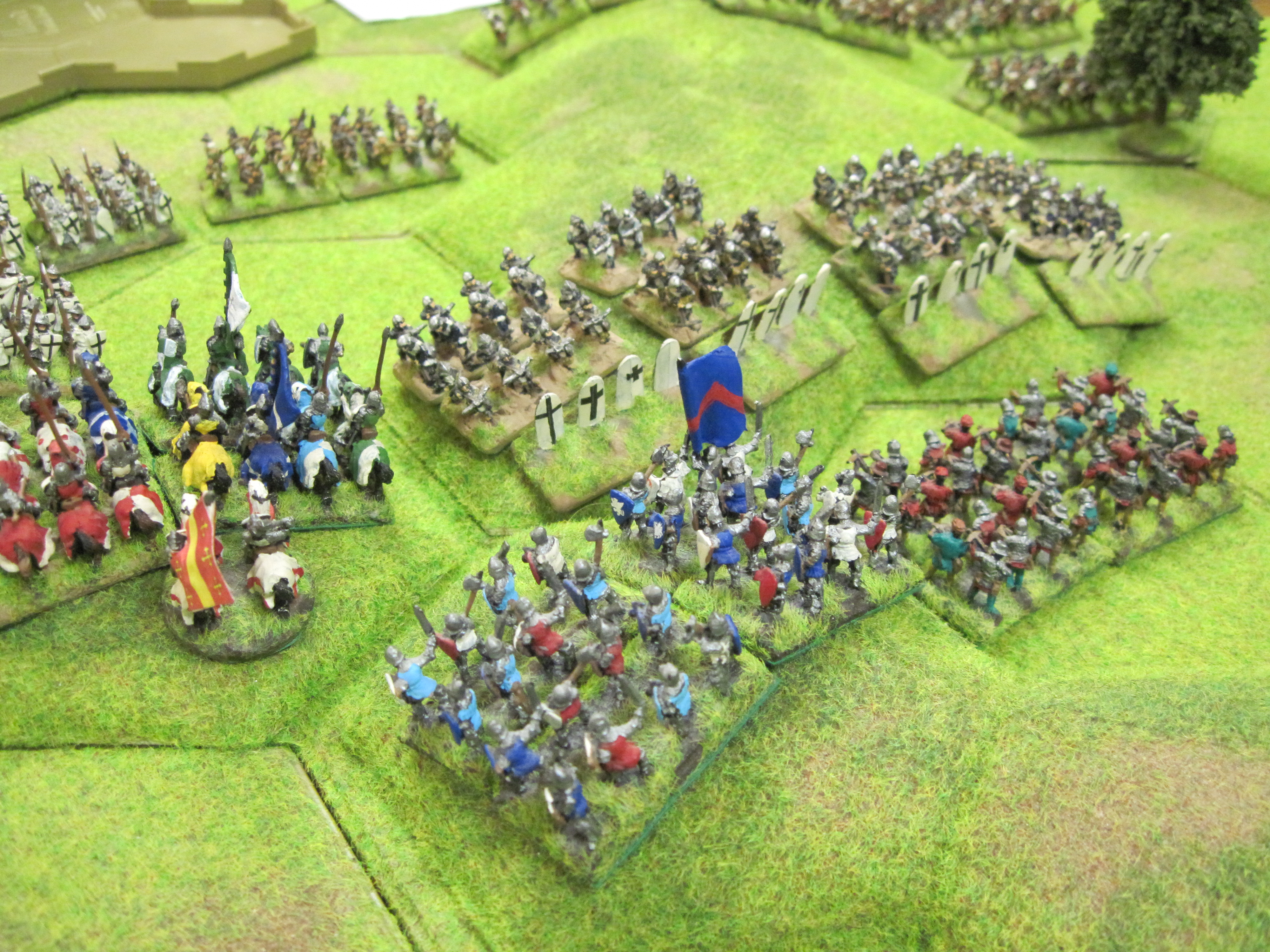 Tim and Steve (Teutonic Order), Mike and Chris (HYW French), deployed their armies centrally before gradually spreading to use the width of the table as both sides advanced and tried to outflank each other. As the crossbow units of both sides advanced to form a shooting line behind their pavisses there were opportunities for both sides to steal a victory with a heavy cavalry charge.