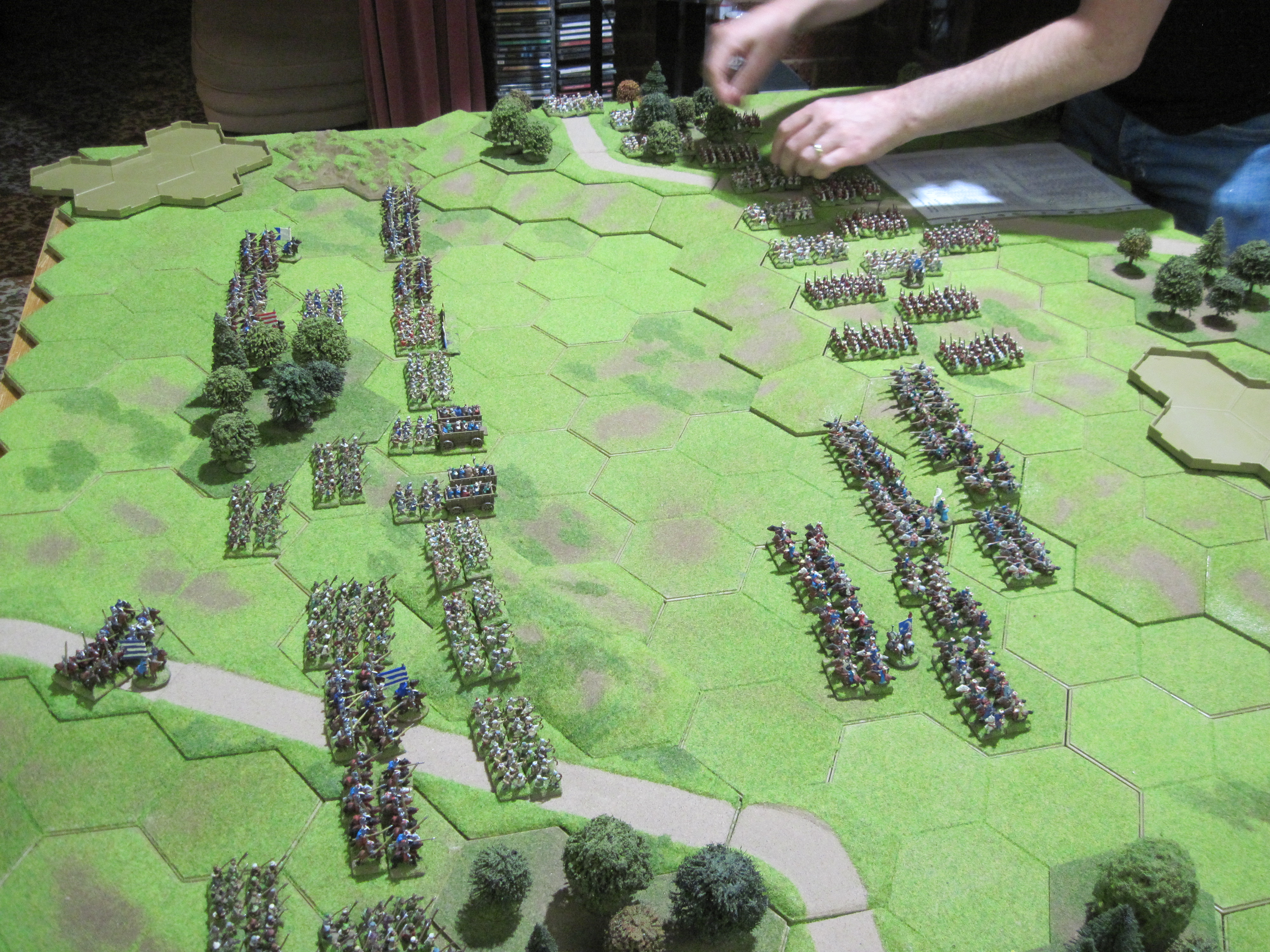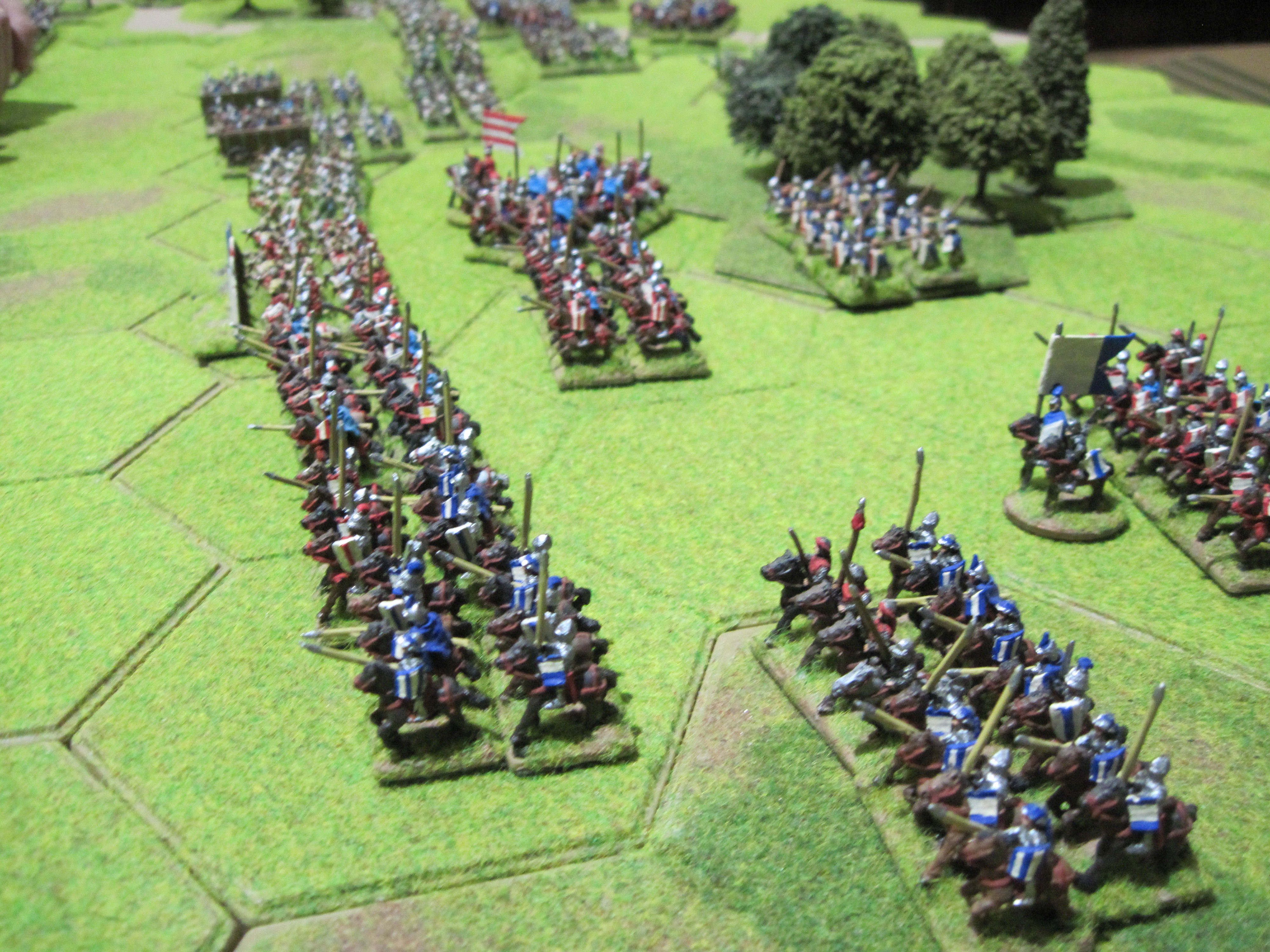 The Ottoman army was typical of the period with nine units of Sipahis and Akinci bow-armed light and medium cavalry and large numbers of infantry consisting of azab archers and spearmen. In contrast, the Hungarian army had 9 units of heavy cavalry accompanied by a mixed infantry force of archers, crossbows, two units of warwagons and accompanying handgunners. Because of the relatively high points of the heavy cavalry, to bulk up the numbers, the Hungarians had 6 units of peasants at only 3 points per unit. This balanced the points cost of the 2 armies at 275 points and also brought the number of units in each army to a more even balance.