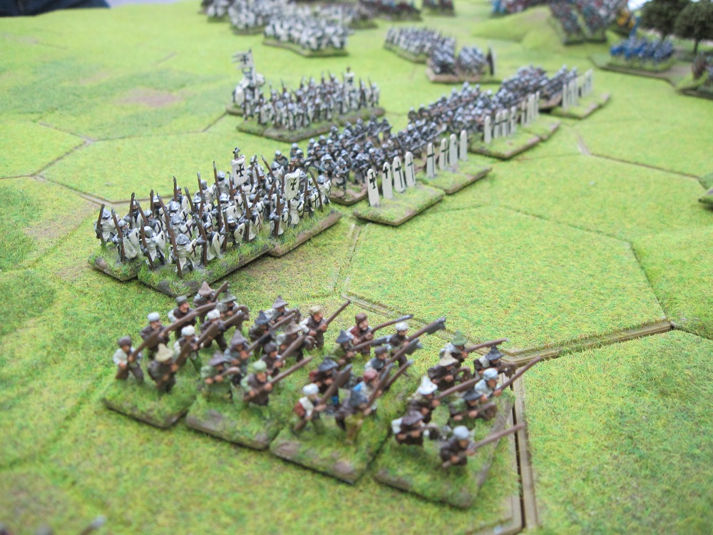 Tim’s decision to pull back his left wing in the face of the advancing French cavalry had the effect of stretching the French battle line which became divided in two by the 4 hex wood half way along. The Teutonic order was as a result able to defeat one half of the French force, with a little help from my poor dice rolls, before the concentrating on the destruction of the other half.