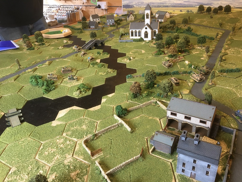 Off-board artillery was called in by both sides with limited effect, however, one salvo did manage to destroy the pontoon bridge which effectively prevented the two German forces from sending support units to each other across the river. The 6pdr was gradually picking off Callum’s tanks but his sdkfzs gave effective fire support to my infantry on the other side of the river which did eventually enable me to capture all of the woodland hexes adjacent to the church but not without sustaining very heavy losses.