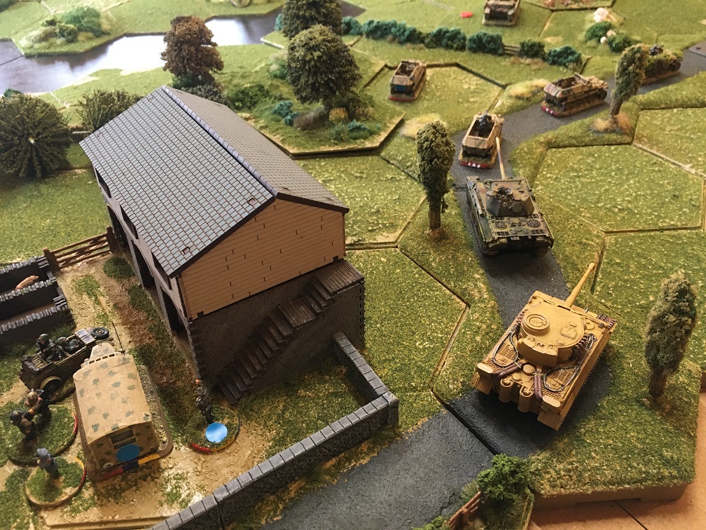 A Tiger I and a Panther tank slowly moved towards a shooting position from which they could bring their considerable firepower into play, but by this point in the game, the warm glow of a multitude of burning German tanks pointed to a clear and decisive British victory. There wasn’t a snowball’s chance in hell that the German attackers could make any further progress into what was a very strongly held village with more British armour flowing to it and then around it. The game conclude with the German units needing to retreat in order to avoid obliteration!