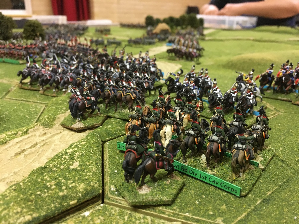 Another large force of French cavalry appeared, this time with heavy dragoons and cuirassiers. They needed some substantial opposition, which arrived in the form of Russian heavy cavalry units advancing along the road towards the village which was now firmly in French hands.