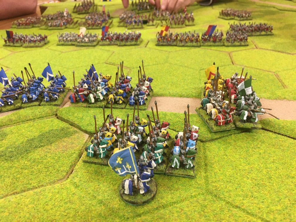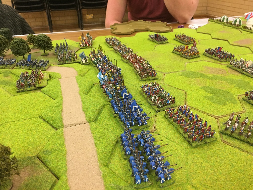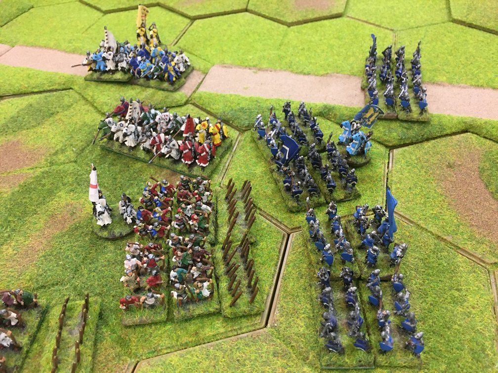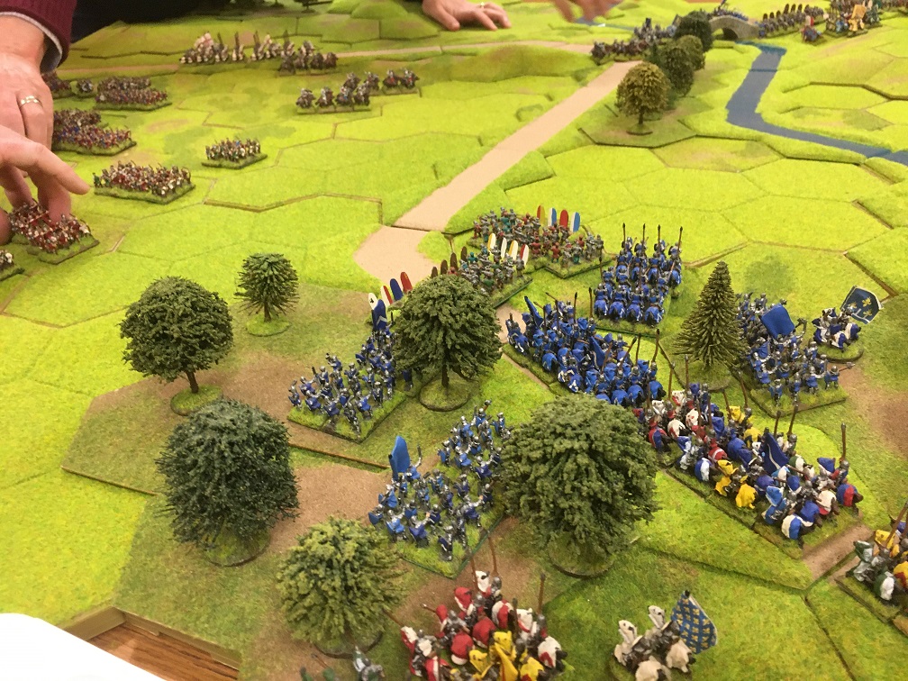 Chris was given the challenging task of racing to prevent Tim’s French crossing the bridge. He had 2 units of mounted men-at-arms (knights), 4 units of mounted sergeants and a general with which at maximum speed he managed to reach a small 3 hex hill overlooking the bridge but not block the bridge. As an aside, I remember thinking at this point that enlarging the game might just make the French mission somewhat easier!