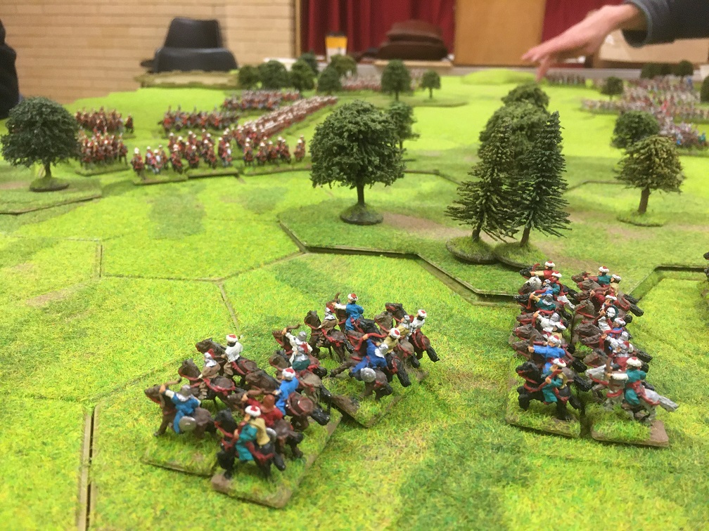 By the time the cavalry shooting match drew to a close with Chris shooting and disrupting the Akinci light cavalry before finishing them of with a charge from the Chinese medium cavalry, my Chinese infantry was almost defeated. The ‘A’ class Ottoman Quapikulu cavalry plus a general had delivered most of the damage and when they disrupted my last unit of Chinese armoured infantry and a general I thought we were done! However, just sometimes the dice can come to one’s aid and a double 6 in the next round of combat saved their bacon. The Ottoman heavy cavalry followed-up my recoiling infantry into woodland hexes where they would fight as if disrupted.