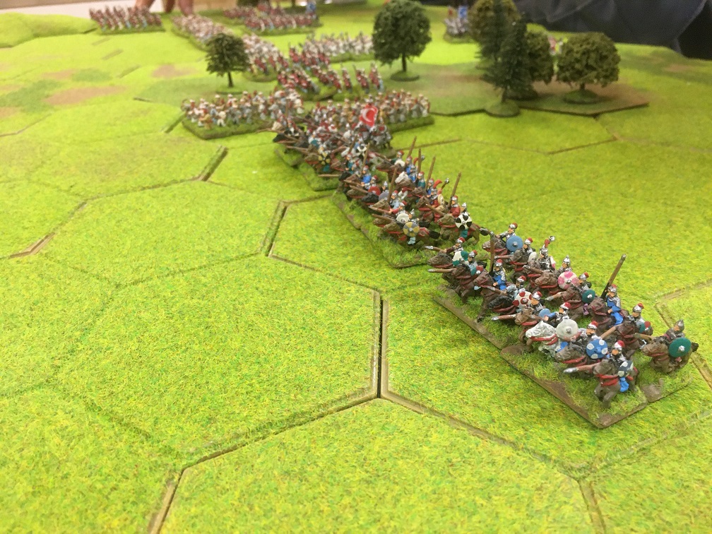 The terrain layout was already set before I arrived slightly late at the club and consisted of open ground punctuated by a large number of multi-hex areas of woodland. The most tactically significant of which was a spine of woodland 2 or 3 hexes wide which stretched almost from one table edge to the other with only a 2 hex wide area of open ground in the middle. The deployment zones of both armies were effectively divided in two which would hinder the ability of the wings of both opposing armies to support each other.