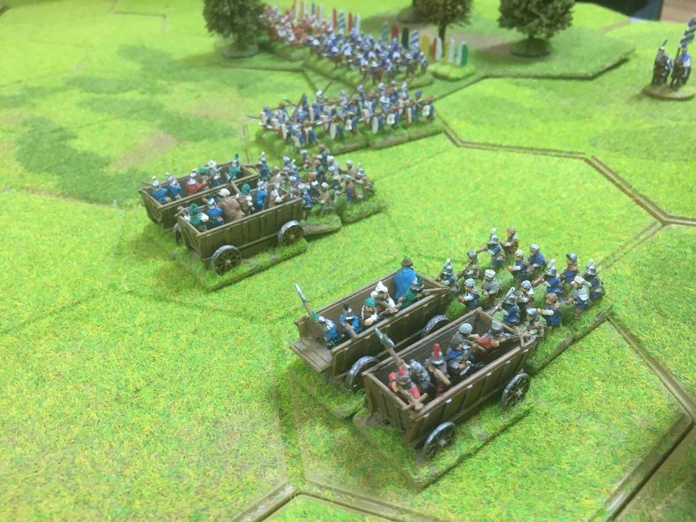 Opening moves saw the Teutonic crossbow units establish an extended line in the centre with the spear units on either flank and heavy knights and mounted crossbows behind. In response, the Hungarians quickly occupied 2 areas of woodland in which they placed their weaker ‘C’ class infantry. Between they deployed their two units of war wagons and crossbow units with pavisses. Again, the heavy cavalry awaited their opportunity behind the centre and left flank.