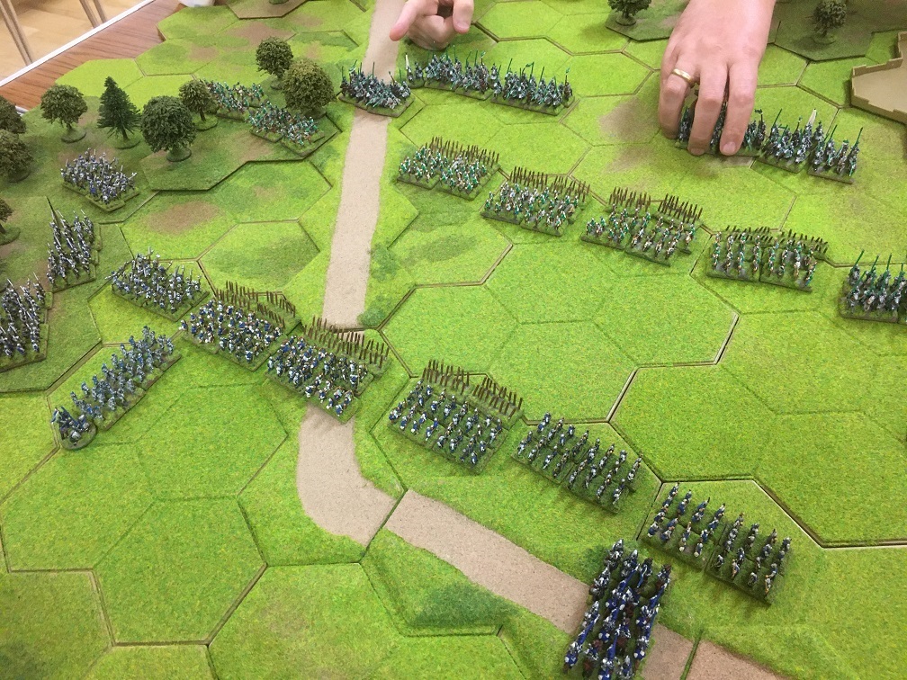 Tim and I had the Yorkists (blues), and Chris and Tony the Tudors (green and white), and our Yorkists got the first move. We reluctantly moved away from our 8 hex hill and set up our longbow shooting line behind our planted stakes just 1 hex in front of the road, the possession of which proved to be an important asset. Tony and Chris echoed our deployment using the 4 hex wood as a bastion protecting their left flank.