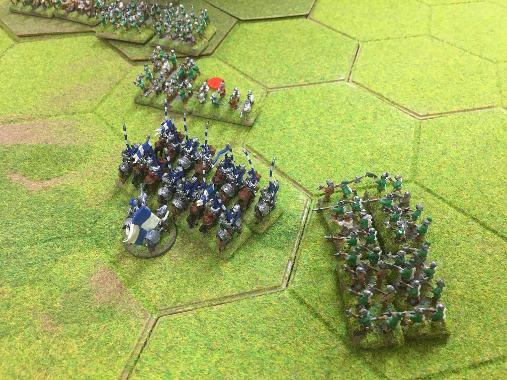 On the other flank Tony advanced 4 units of Tudor heavy cavalry plus 2 units of infantry emerging from the 4 hex wood against my extreme right flank. In response I sent forward the hobilars to hopefully buy me sufficient time to get my heavy cavalry ready to receive the anticipated cavalry charge. Remarkably, the hobilars where disrupted but held their ground against a unit of Tudor longbow.