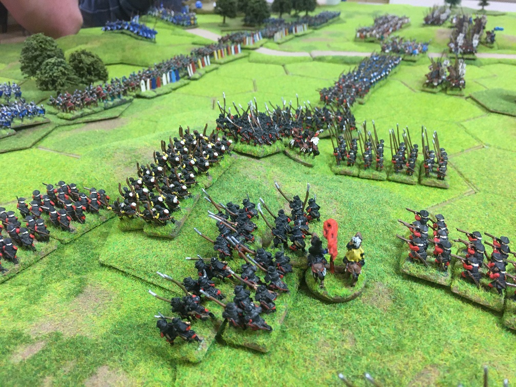 In the meantime, the infantry battle for control of the woods between James and Chris which had been swing back and forth with mounting casualties on both sides, started to swing in favour of the French. But, more importantly, this side battle prevented the Samurai infantry from coming to support the Samurai cavalry in the centre.