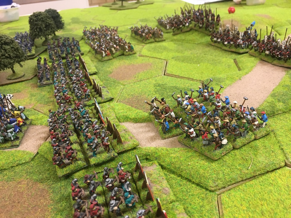 The resulting weakened French centre should have been a prime target for Tony’s 5 units of mounted Samurai. However, there was a mass of disrupted and fleeing Samurai peasants in the way having received a severe beating at the hands of the French peasants and crossbow units who were beginning to find their targets rather successfully.