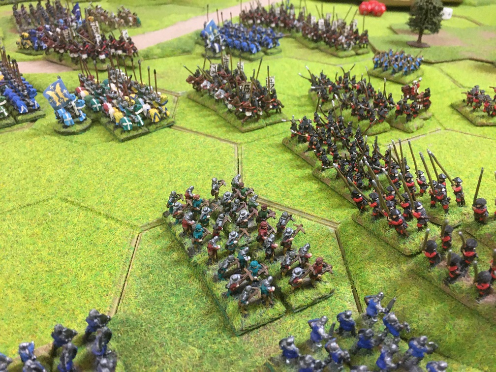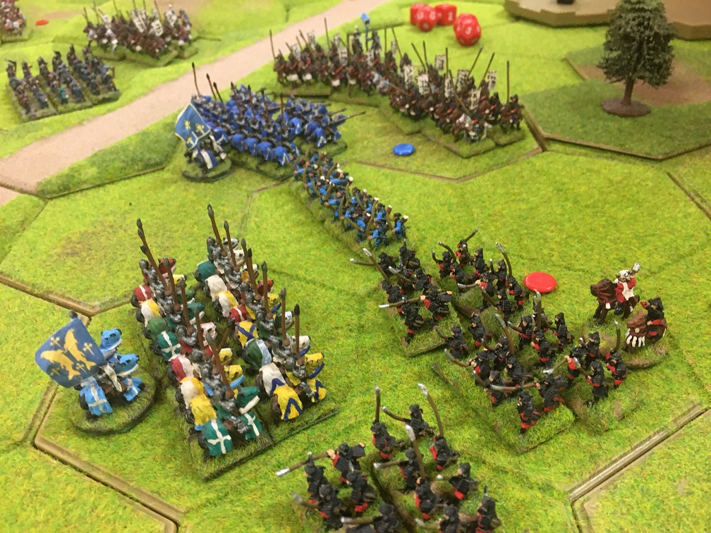 With both armies deployed 4 hexes in from the table edge, first move went to the French who advanced their crossbow units forward in a line with their heavy cavalry following-up behind.