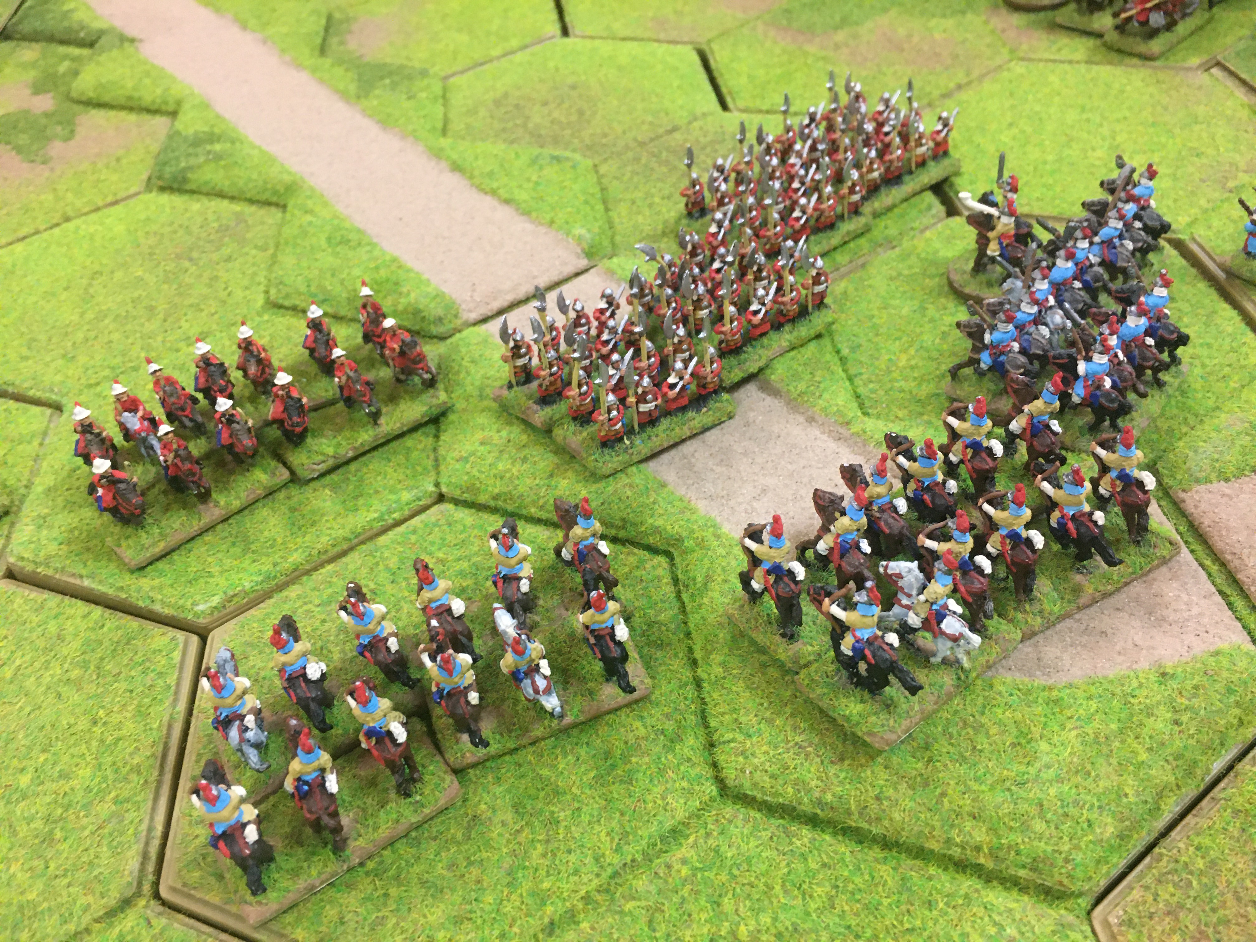 With the Chinese cavalry retreating behind the cover of this aforementioned woodland I was able to occupy the area up to the Chinese table edge with my Korean light cavalry. The gap between the wood and the Chinese table edge was only 2 hexes wide but I planned to send my light cavalry through this gap and attack the Chinese rear was soon as the opportunity presented itself. Trying to disguise this intention was the tricky bit!