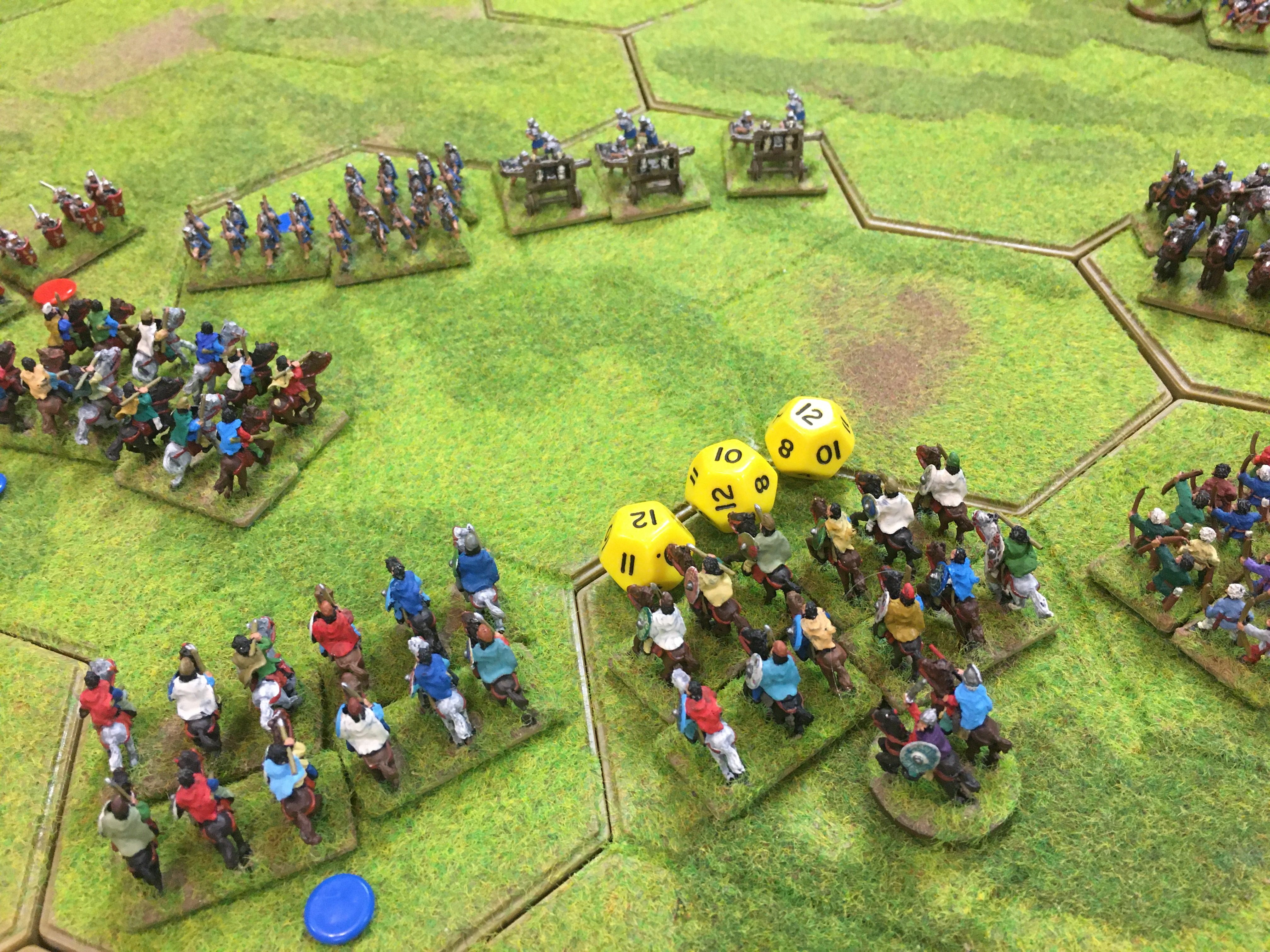 As the armies closed on each other, Tony’s Roman cavalry units quickly advanced through the single hex gap between the 8 hex escarpment and an area of woodland. This gave my Dacian cavalry the difficult choice of evading or standing their ground. With the assistance of a couple of Dacian hordes they decided to stand and fight. Meanwhile, James’s legionaries continued their slow advance in the centre while Chris’s Roman Auxillaries formed up along the ridge of the small escarpment and woodland.