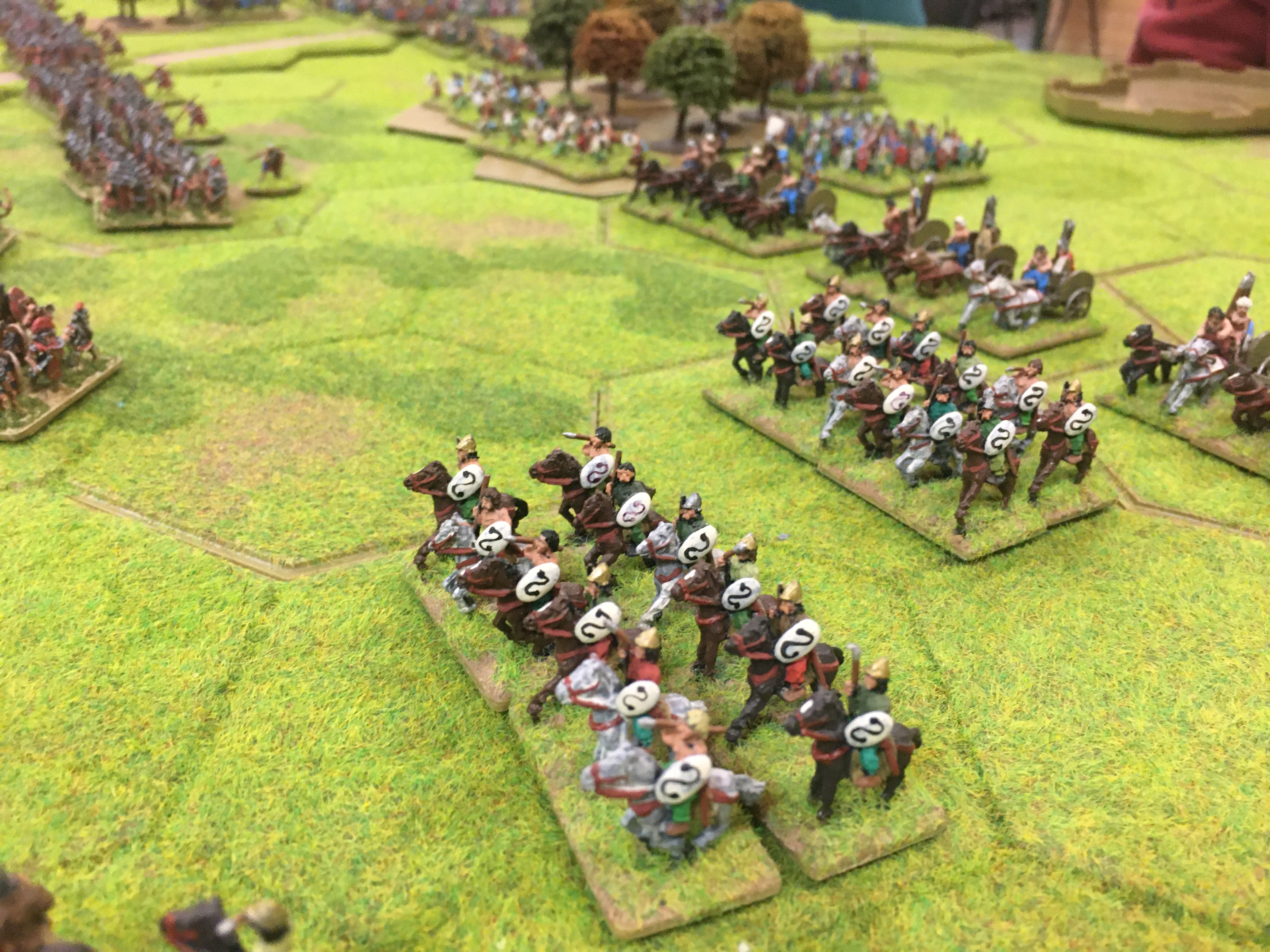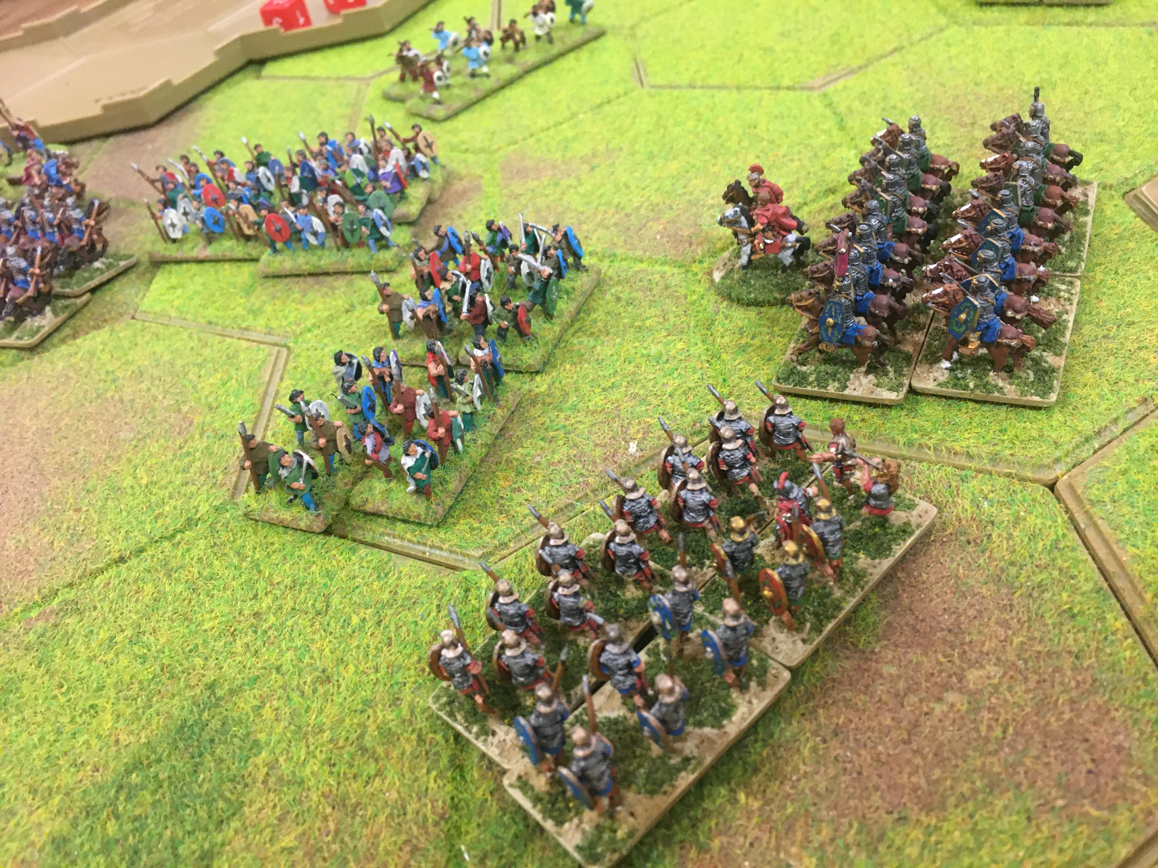 On my Roman left wing I was forced to throw caution to the wind and charged my 2 heavy cavalry units each accompanied by a general into the British warriors that had already dispatched my archers and auxiliary spears earlier. This time the hand-to-hand combat results went decidedly in my favour and the warriors were routed with my Roman cavalry in pursuit. On Tony’s Roman right wing, he and Tim had been taking chunks out of each other for close on 2 hours. The resulting attrition had diminished both sides to the point that neither side had the resources left to gain any meaningful territorial advantage