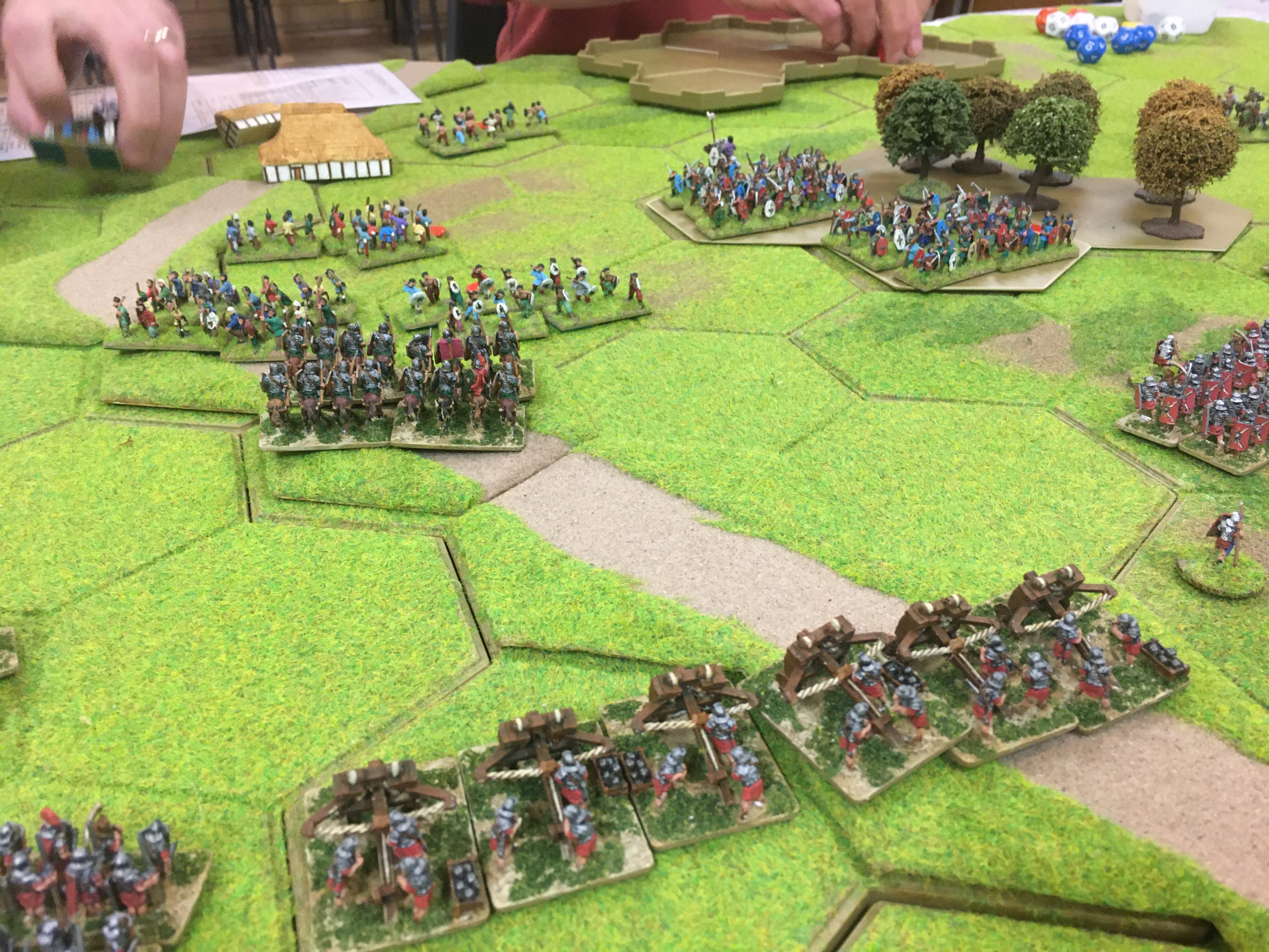 Finally the Roman ballista units had moved into position to shoot, unfortunately their accuracy was poor and the Brits easily weathered the hail of badly aimed missiles. Tony and I moved our Roman line forward a hex only to receive more missile inflicted punishment. The legionary units were already beginning to accumulate in the casualty tray! I advanced the Roman archers and skirmish unit to engage the extreme right of the British line. They inflicted some damage on the British warriors only to charge and demolished in the next round of combat by other warriors. I had been holding back 2 units of Roman cavalry and 2 available generals as my last reserve, and this latest set-back inflicted by Chris’s warrior hordes left me with the difficult decision; to charge or not to charge!