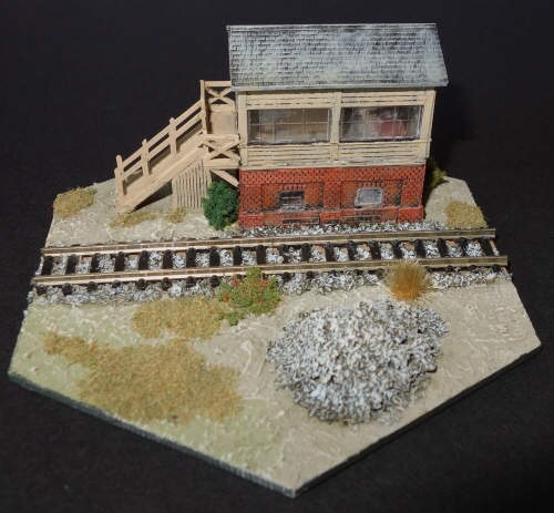 The shots shows the signal box being fixed to the hex tile and the tile 'dressed' with track and a pile of stone chippings.