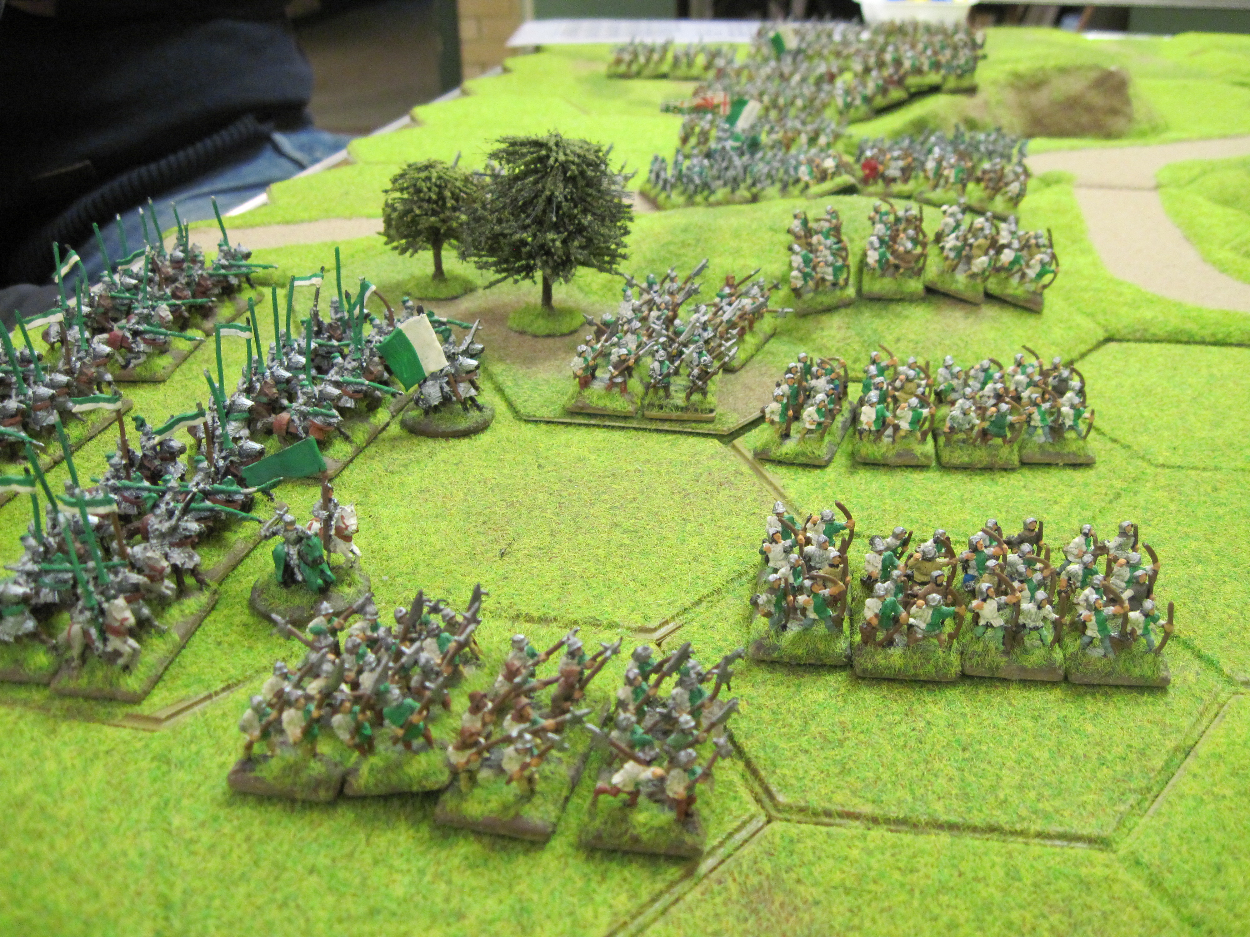 Chris advanced the bow and bill units of the Tudor left wing against Dave’s extended line of longbows occupying the central spine of woodland and broken ground. Tim advanced his infantry in the centre while I positioned my cavalry units to his right ready to receive any charge by Tony’s cavalry.