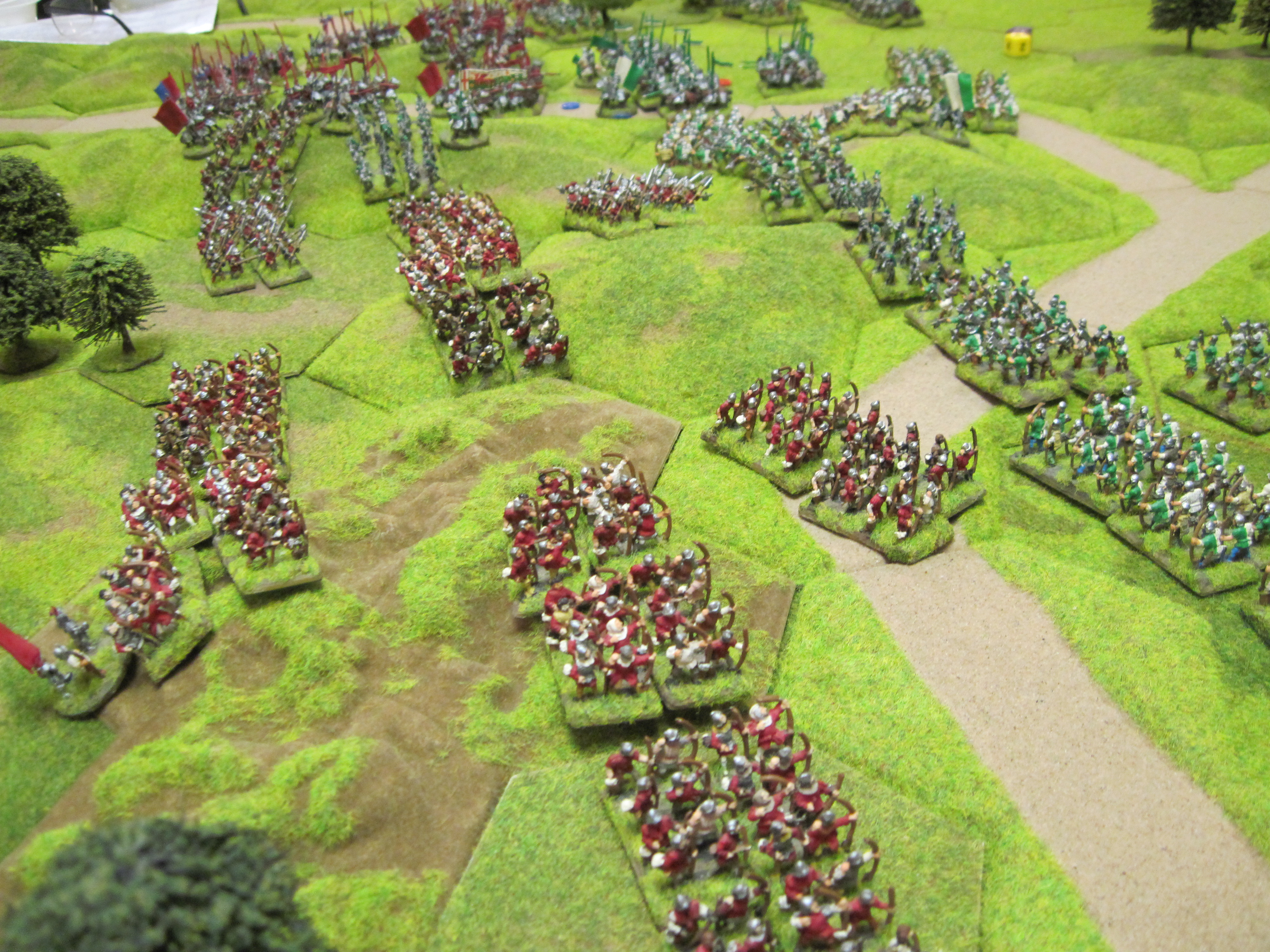 Dave started to pull his longbow units back towards the centre away from Chris’s infantry which had finally gained parts of the woodland. But in the centre Dave advanced the Yorkist bill units against Tim’s already hard-pressed infantry. The heavy cavalry of both sides had inflicted equal losses on each other, but the extra 3 units of Yorkist mounted-men-at arms finally tipped the balance with the help of Dave’s bill units. Despite some rewarding local victories and very temporary reverses, a Yorkist victory was guaranteed at the point at which the Yorkist cavalry successfully counter-attacked. The accurate and consistent shooting of the Yorkist longbow throughout the game had sucked away the strength of the Tudor army before the brutal hand-to-hand combat had really started to suck in reserves.