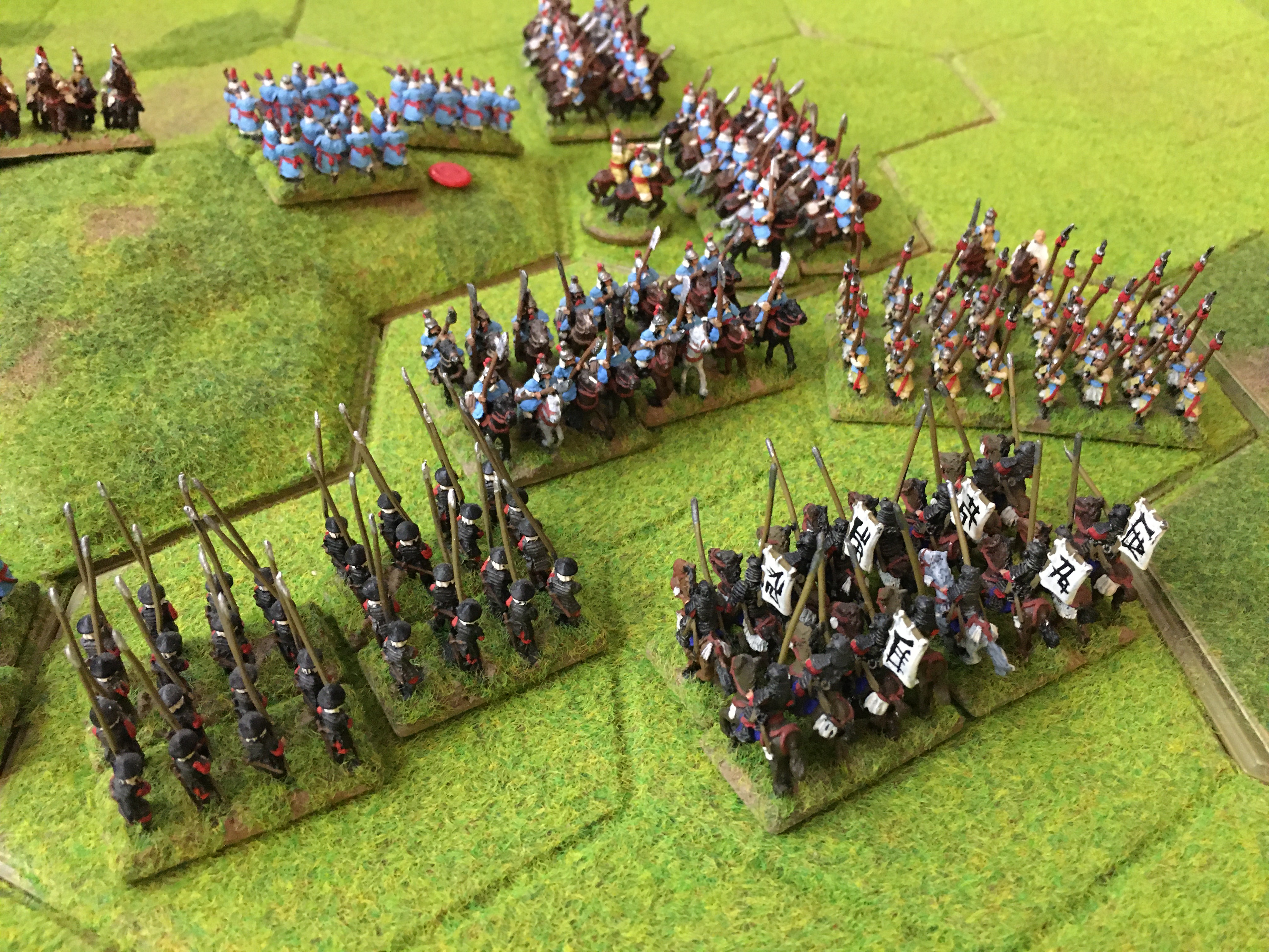 Alex also halted his line and then sent 5 units of mounted Samurai towards the ‘North end’ or my left wing to circumnavigate around the aforementioned 4 hex wood. This was a clear attempt to get behind my left and rear and in response I had to switch my 3 units of heavy cavalry and a unit of spearmen to plug the gap between the wood and my table edge.