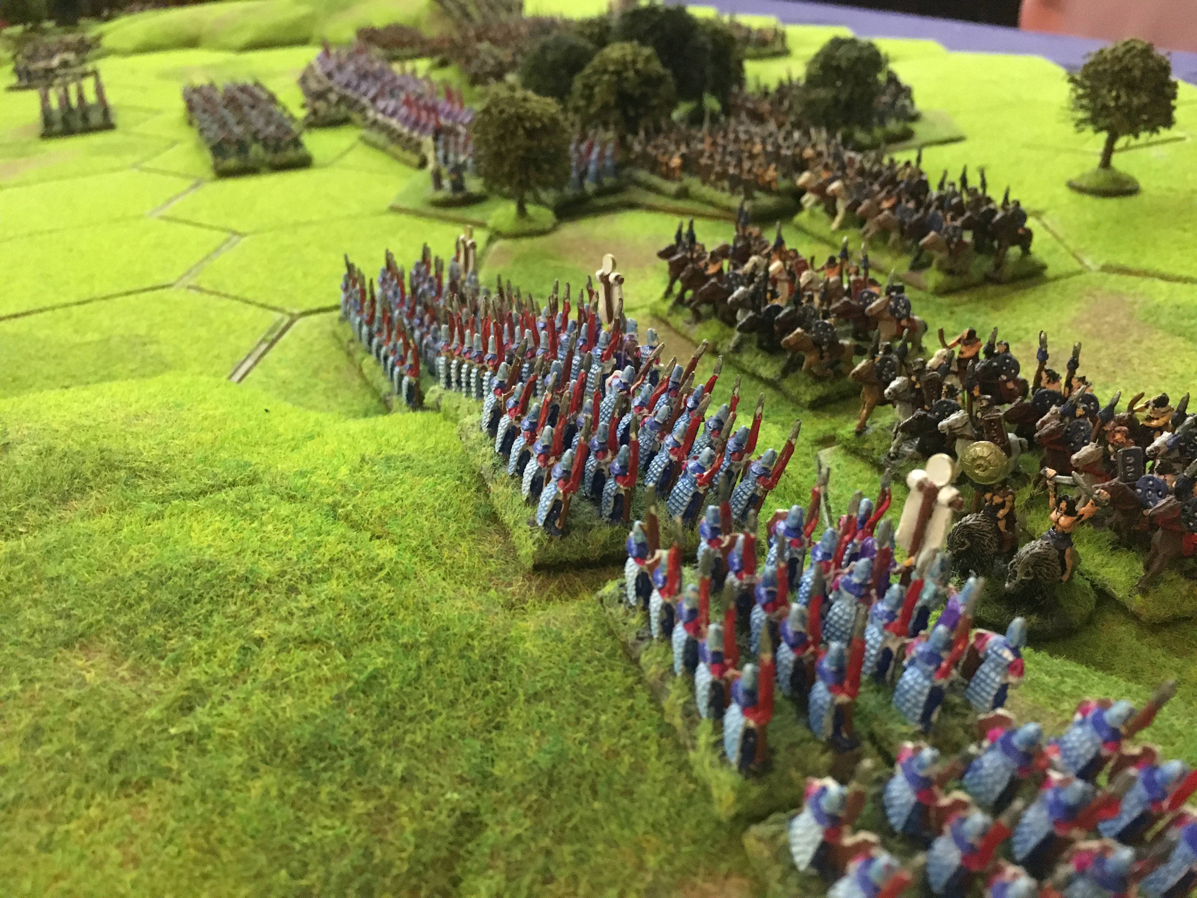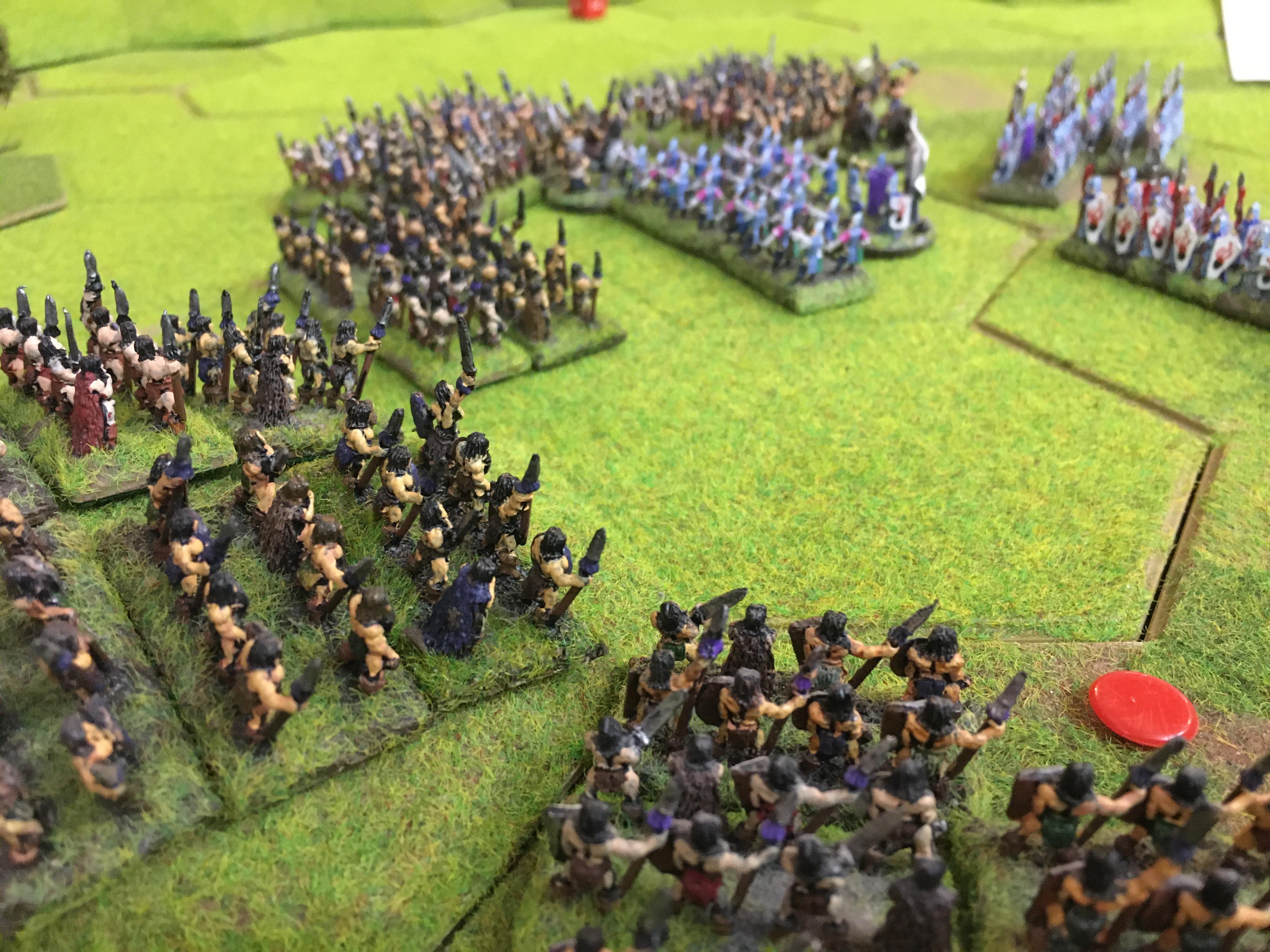 It was only fair to give Sally the choice of table edge and after both armies were deployed, she won the di roll for first move. The High Elves advanced in a line with 3 units of archers to the fore. The unit of bolt shooters and the other 2 units of HE archers were kept on a 4 hex escarpment on the left of the line. I in response moved my barbarian cavalry to the left of my line facing the HE Spears, but focused on keeping possession of the central wood and adjacent hill. I wanted to keep my hordes on the reverse slope of the hill as protection against the High Elf shooters. I had combined my hordes into units of 6 stands reducing the number of horde units from 12 to 8 in order to make them strong enough to fight the HE Spear units.