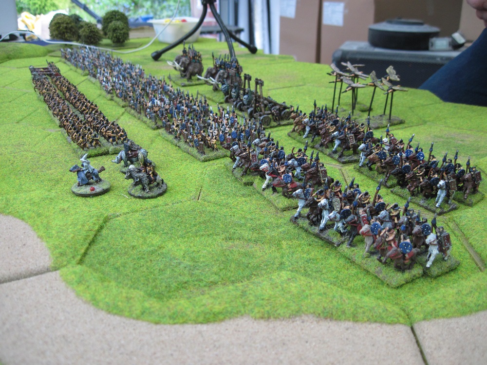 The dice roll for choice of first or second deployment went to Tim and I which gave us the advantage of responding to the Barbarian deployment with our units organised to deliver a specific game plan. However, with one player from each side in a remote location it is impossible to discuss battle plans without communicating this to your opponents as well!