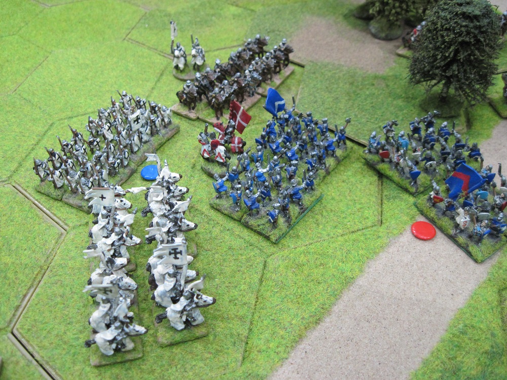 Tim’s decision to pull back his left wing in the face of the advancing French cavalry had the effect of stretching the French battle line which became divided in two by the 4 hex wood half way along. The Teutonic order was as a result able to defeat one half of the French force, with a little help from my poor dice rolls, before the concentrating on the destruction of the other half.