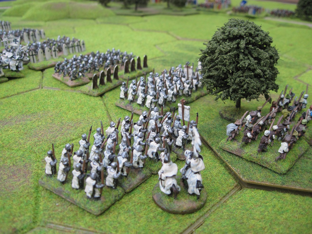 Tony, won the di roll for first move and he quickly advanced to take possession of the 2 areas of woodland between which he deployed his 5 units of French crossbow with pavisses to the fore! He concentrated 7 of his 8 units of cavalry on his right wing along with 2 of his 3 generals. In response, Tim matched up his 4 units of crossbow with Tony’s, again with pavisses in front. Behind these he created a mixed line of Teutonic spears knights and 2 units of mounted crossbow. However, more significantly his line of crossbow was extended using 5 units of peasant militia which created a sacrificial block against any potential French massed cavalry charge.