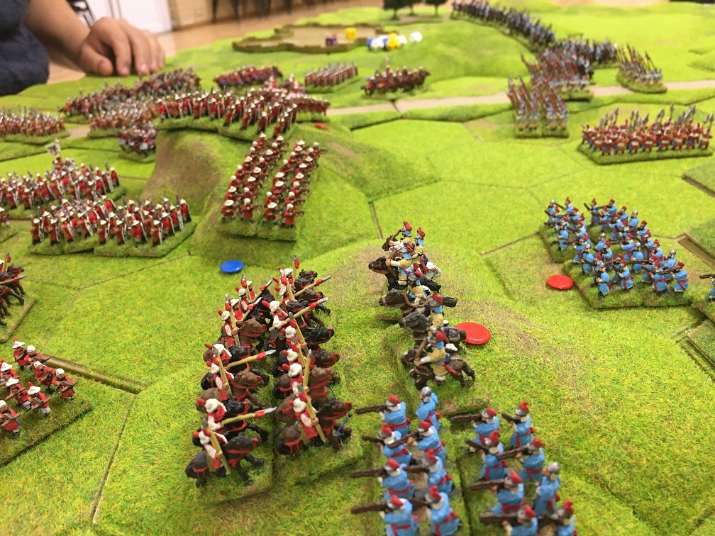 The relative positions of the two armies to the main terrain features at this point of the game had made the escarpments into a ‘water-shed’ and when units successfully crossed over they were quickly overwhelmed by the more numerous enemy on the other side. Only Tony’s flanking light cavalry had managed to circumnavigate around the escarpment and attack from the side, but this option was now gone as these mobile shooters now formed the backbone of the Chinese central defence.