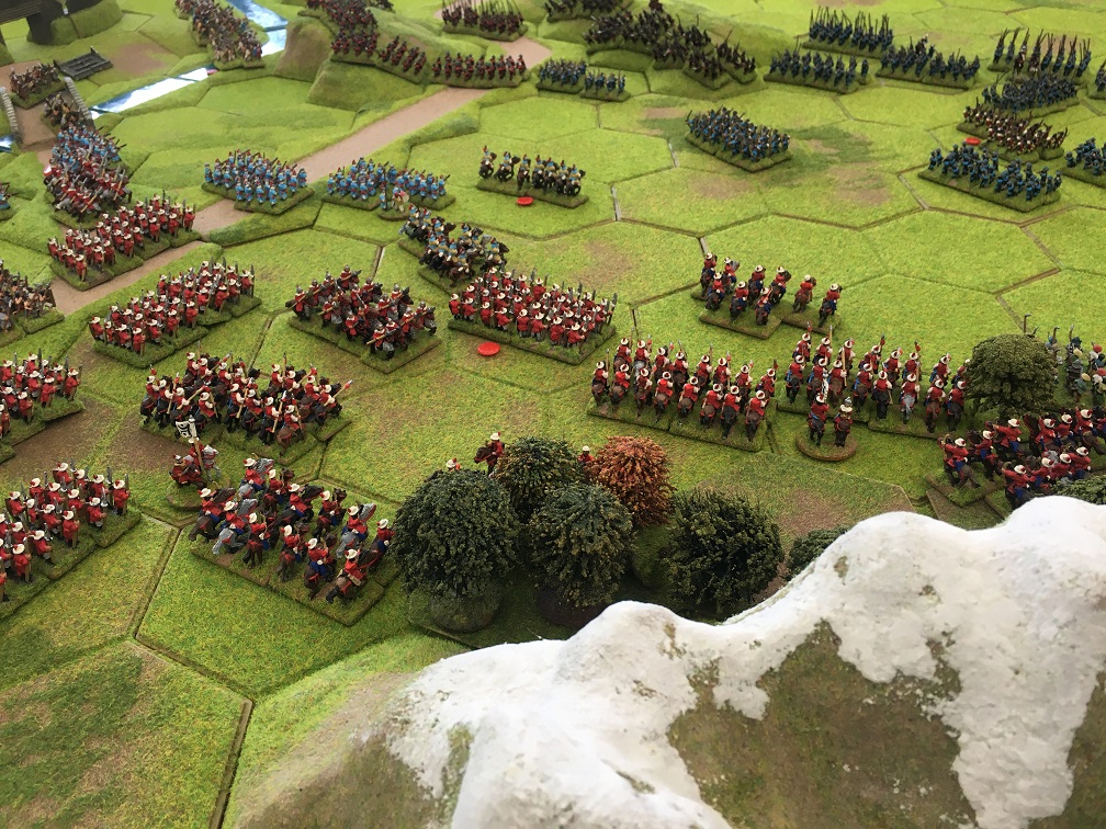 The Samurai army under the command of Dave Mac advanced towards Tim’s Korean cavalry which resulted in a cavalry on cavalry encounter. The Korean militia and spear units were held in reserve along with the Korean handgunners and militia holding the fort guarding the pass through which the Ming army was expected to arrive.