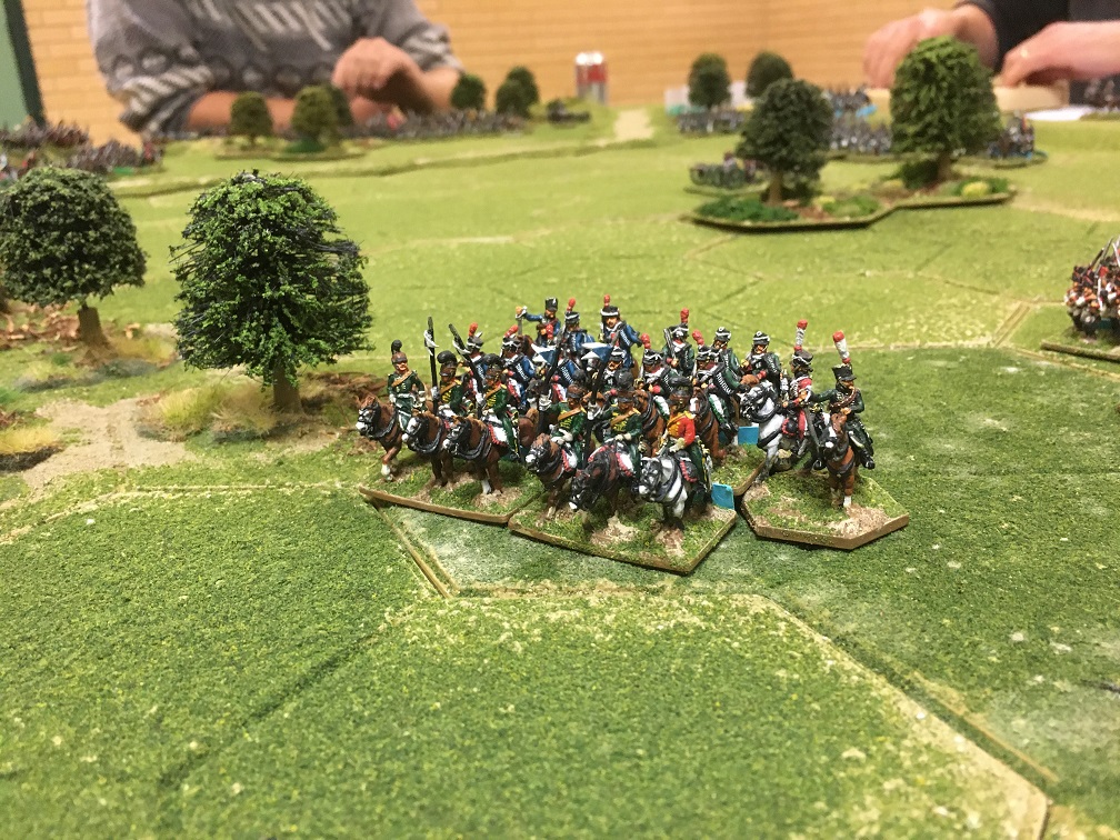 On the other wing Chris’s infantry also formed square as a six strand unit of French cavalry moved around the edge of the woodland against them followed by columns of infantry. On this wing space was more restricted and Chris’s Russian infantry held their position pretty well but not without a fair degree of sacrifice once the French infantry moved into musket range.