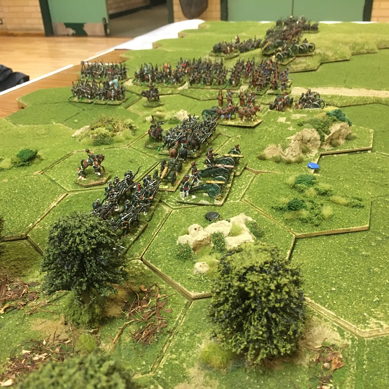 Thanks to Dave for organising this game using his own bespoke Hexon terrain and extensive collection of Napoleonic miniatures. In this game we used a modified ‘Combat results Table’ in response to issues identified in our recent Napoleonic games which this new table would hopefully address. In this Scenario the Russian force had 3 infantry divisions which included 3 heavy gun batteries and 2 light gun batteries which formed a formidable gun line. The French had force also had 3 brigades; a central infantry division commanded by Tim, and 2 combined infantry and cavalry division supported by 4 light gun batteries commanded by Tony and Dave.