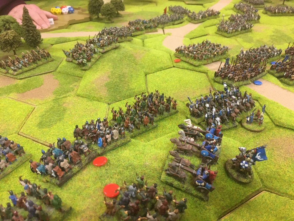 Opening moves saw Tony quickly advance his Saxon hordes to gain control of the 3 hex wood on the extreme right of his line. Tim moved his cavalry quickly on a flanking move against Dave’s select fyrd on the other wing. Chris concentrated his missile infantry supported by the ballista unit in the centre.