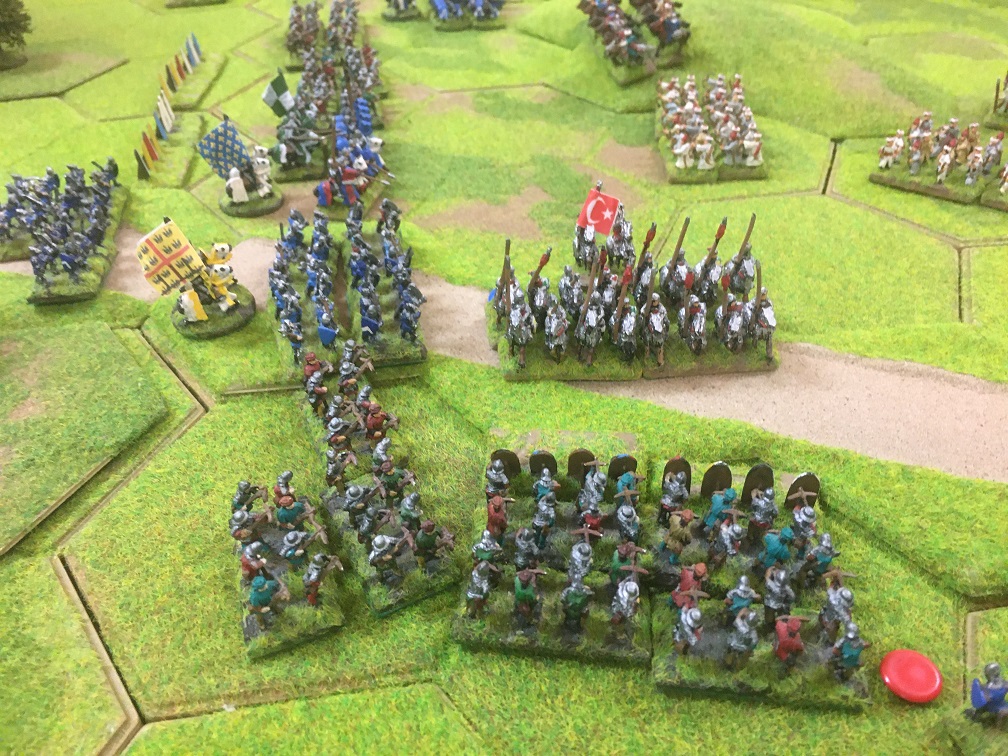 In tune with the ‘terrain fare’ policy the terrain layout was decided and all elements placed before the players knew which armies were to be engaged. This policy was very important in a game such as this with the Ottoman army’s strength in missile armed cavalry pitted against the slower French mounted heavy knights and sergeants. The Ottomans would favour the more open battlefield in this case the open centre of the table was surrounded by a scattering of small woods and a very useful 8 hex escarpment.