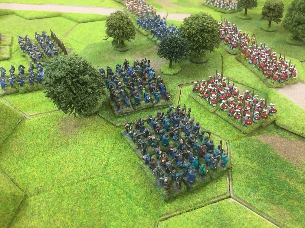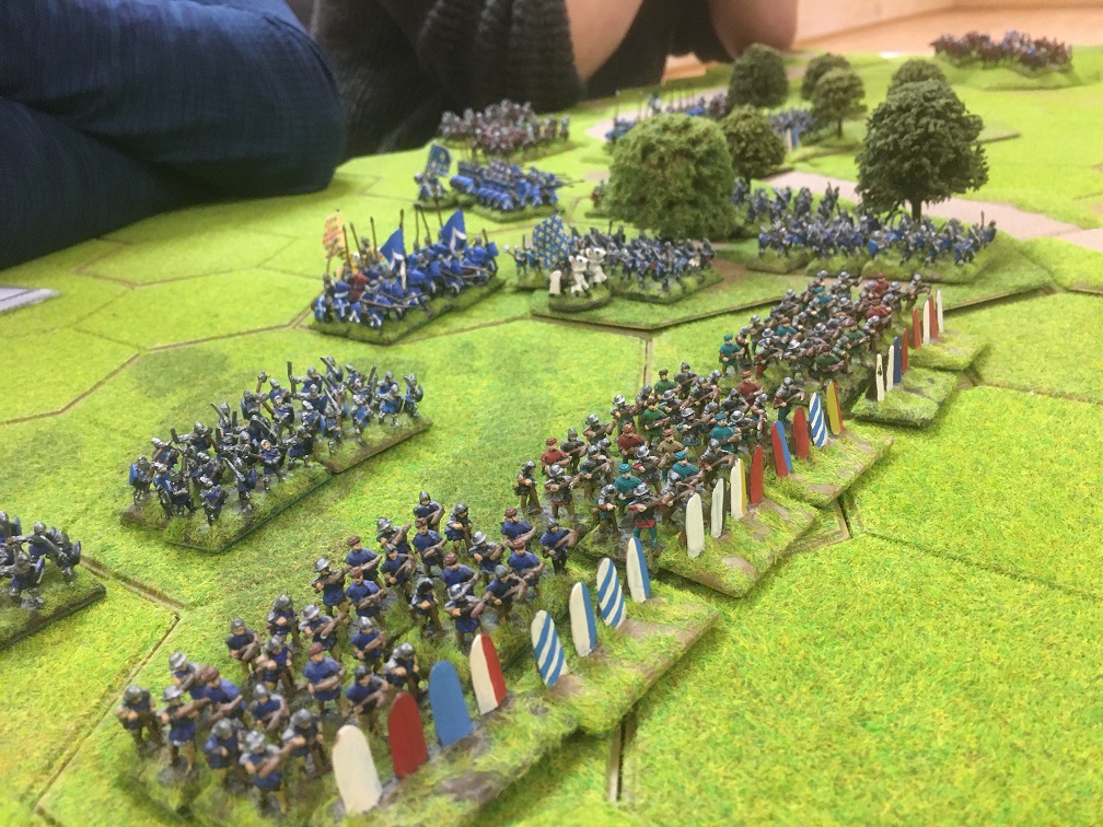 The choice of table edge fell to Tony, James and I, which gave us an opportunity to pick the side which gave the most cover for our French army. Dave and Tim (Ottomans), did quickly advance in their first move to occupy the open centre of the field but were confronted by small, French filled woods. Between these were stationed the French crossbow units behind a wall of pavisses. Quite a formidable barrier the Ottomans who also had the steep slope of the 8 hex escarpment facing their left flank. Because the steep slope was unscaleable with cavalry we positioned our weakest French units, 3 peasant hordes behind this obstacle.