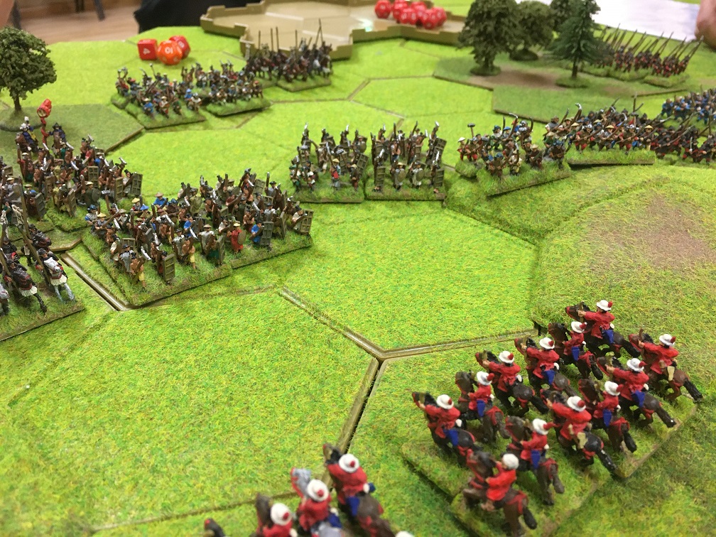 Let the game begin! Both armies advanced to quickly take possession of the numerous terrain pieces and I said to James that this terrain favoured the infantry. The most open area was on our left where we concentrated all our light and medium cavalry with our heavies in reserve. 4 of the 5 units of Samurai drew up in a line to face them with the multitude of peasants following up behind to occupy the woodland. Chris lead most of the rest of the Samurai infantry on what became a sweeping flanking manoeuvre. James took possession of the 3 hex escarpment and arranged his Chinese crossbow units in its defence.