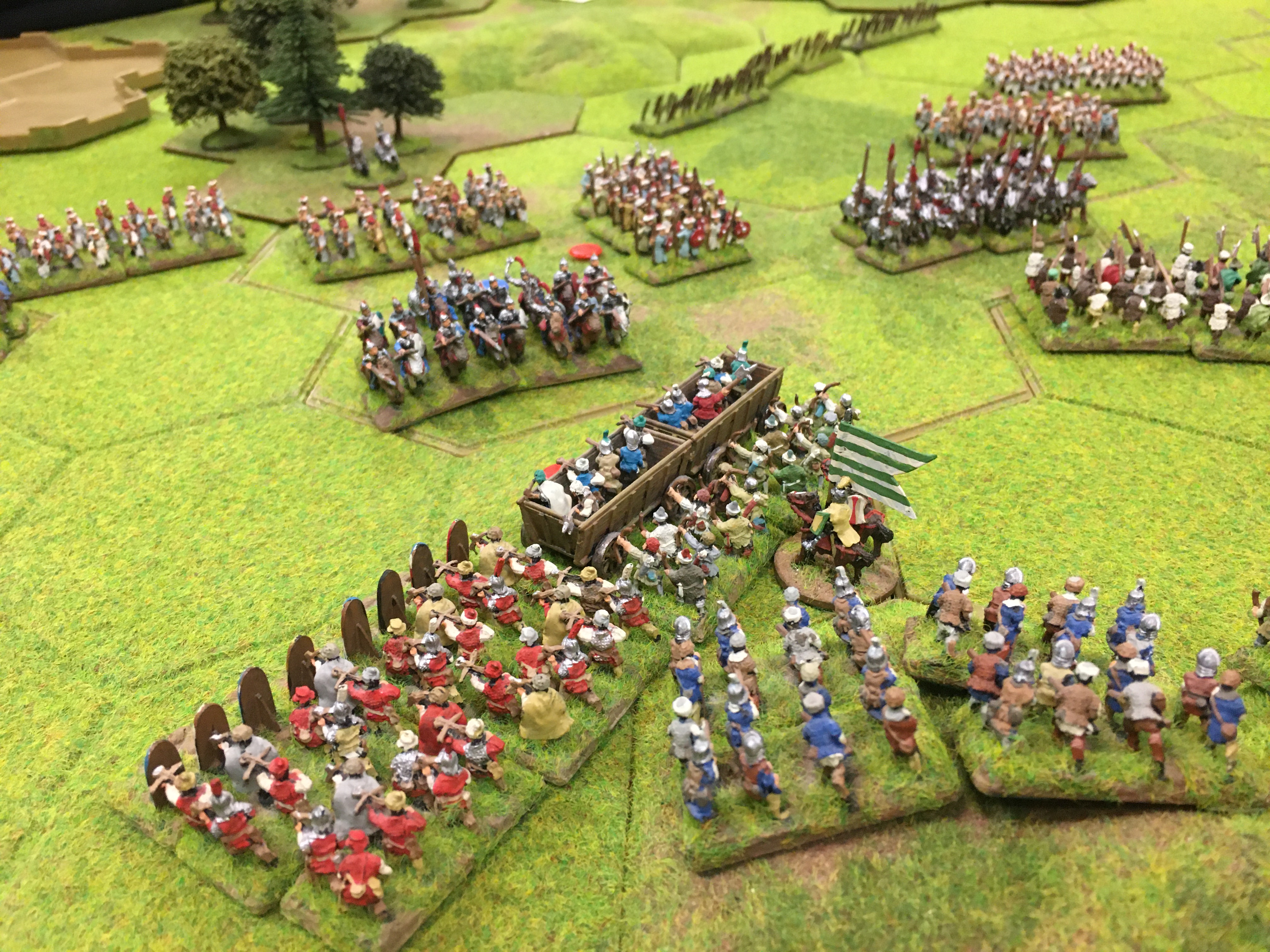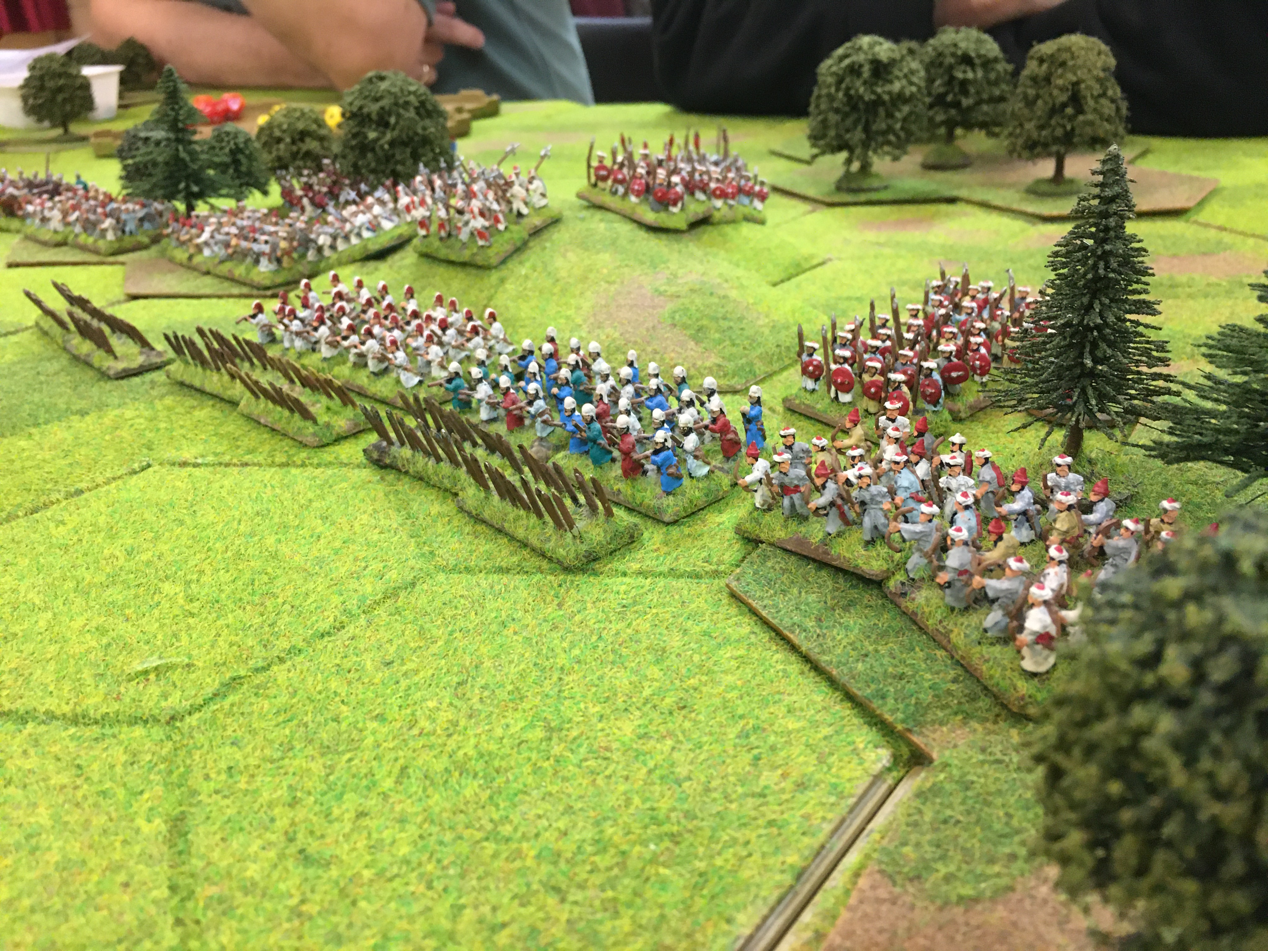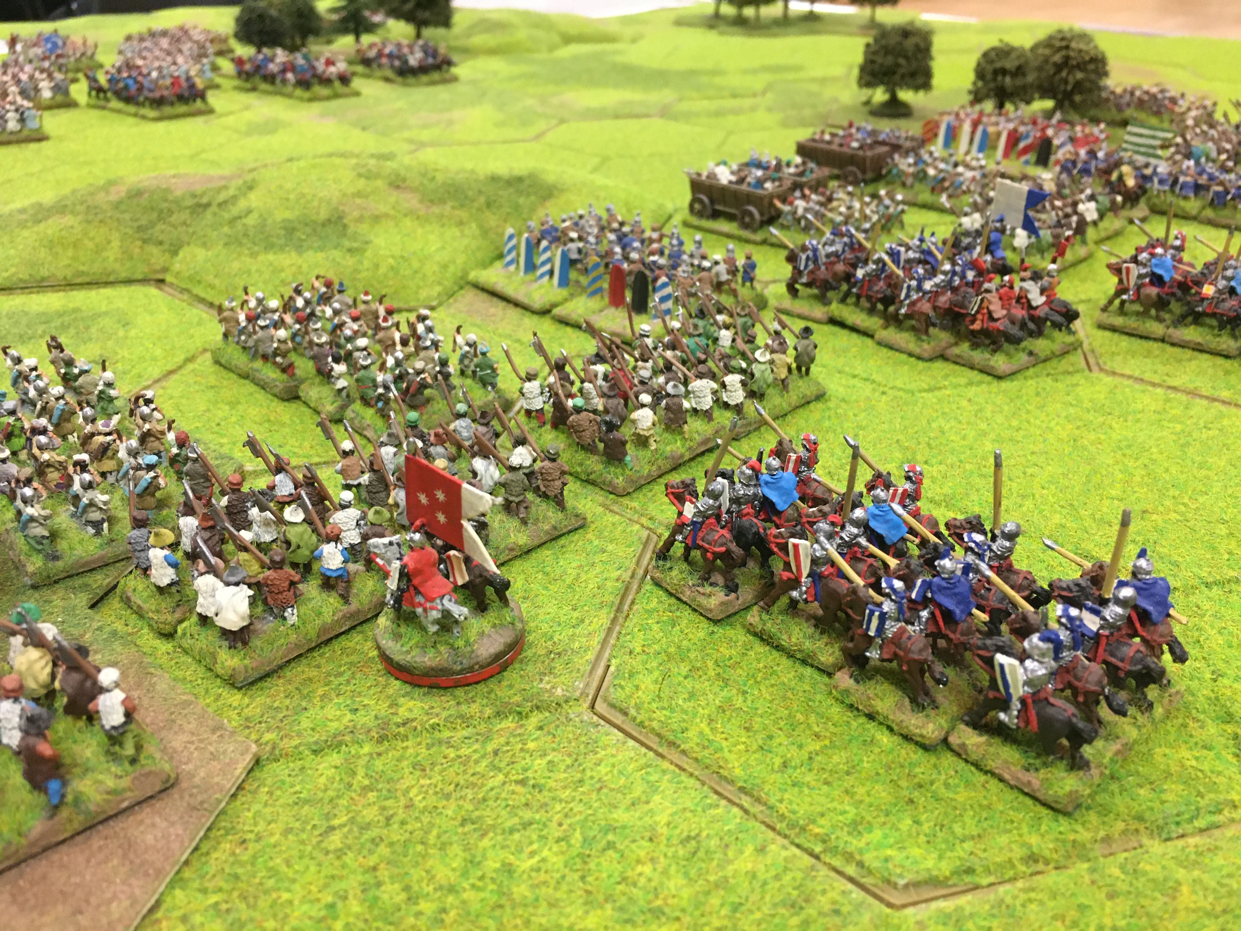With the Ottoman infantry now in possession of the right hand wood the 3 remaining Hungarian heavy cavalry couldn’t get through the mass of disrupted Hungarian peasants and archers in the middle. Also, my archers missed a tactical move because they were out of command and control range of a general. As a result the two armies effectively bounced off each other and reformed in two diagonal lines across the table. I’m sure that in real life they would be snarling at each other in utter frustration! All players realised that despite herculean efforts from both sides that the Hungarians and Ottomans had pummeled each other into a draw once again.