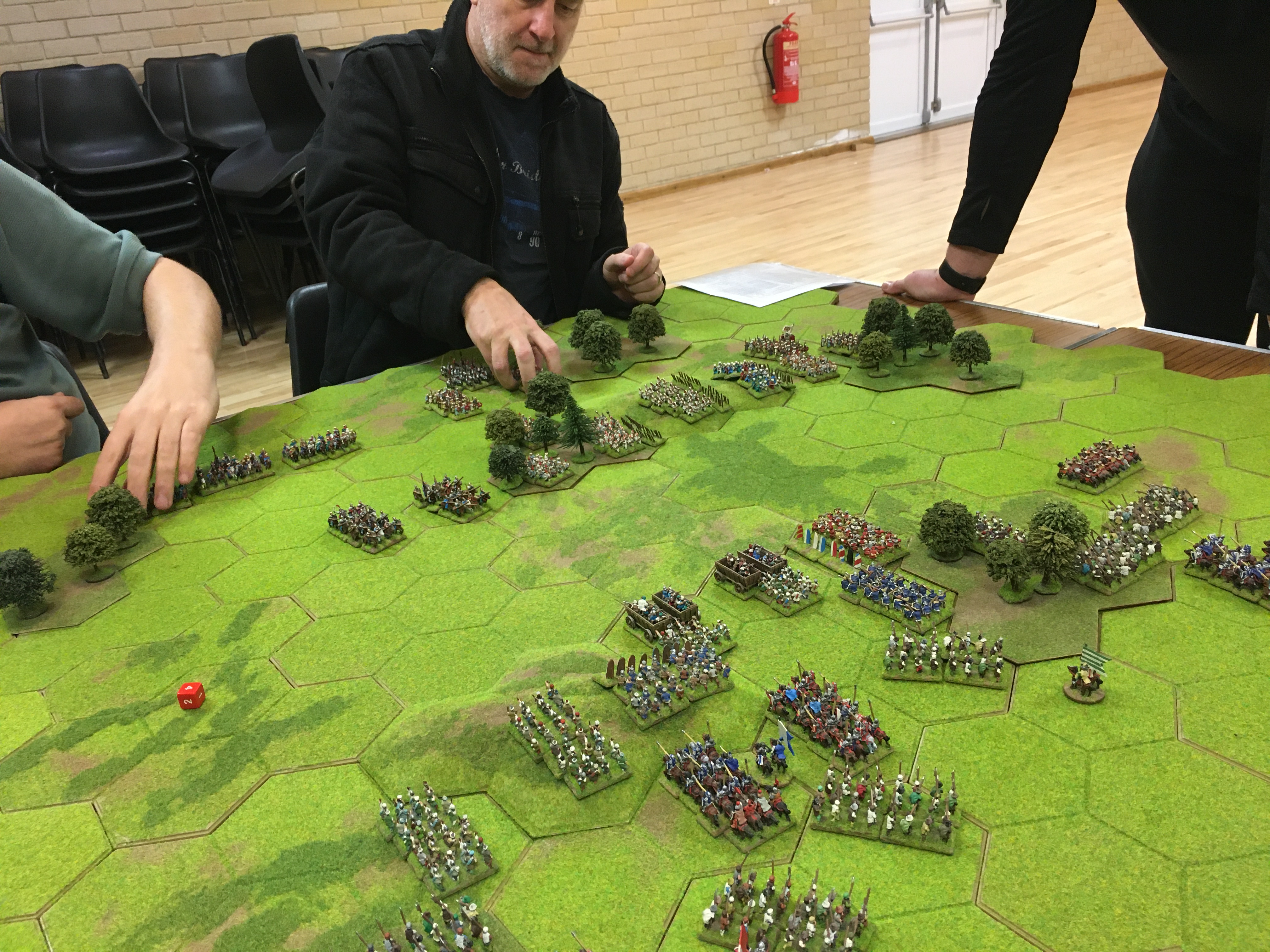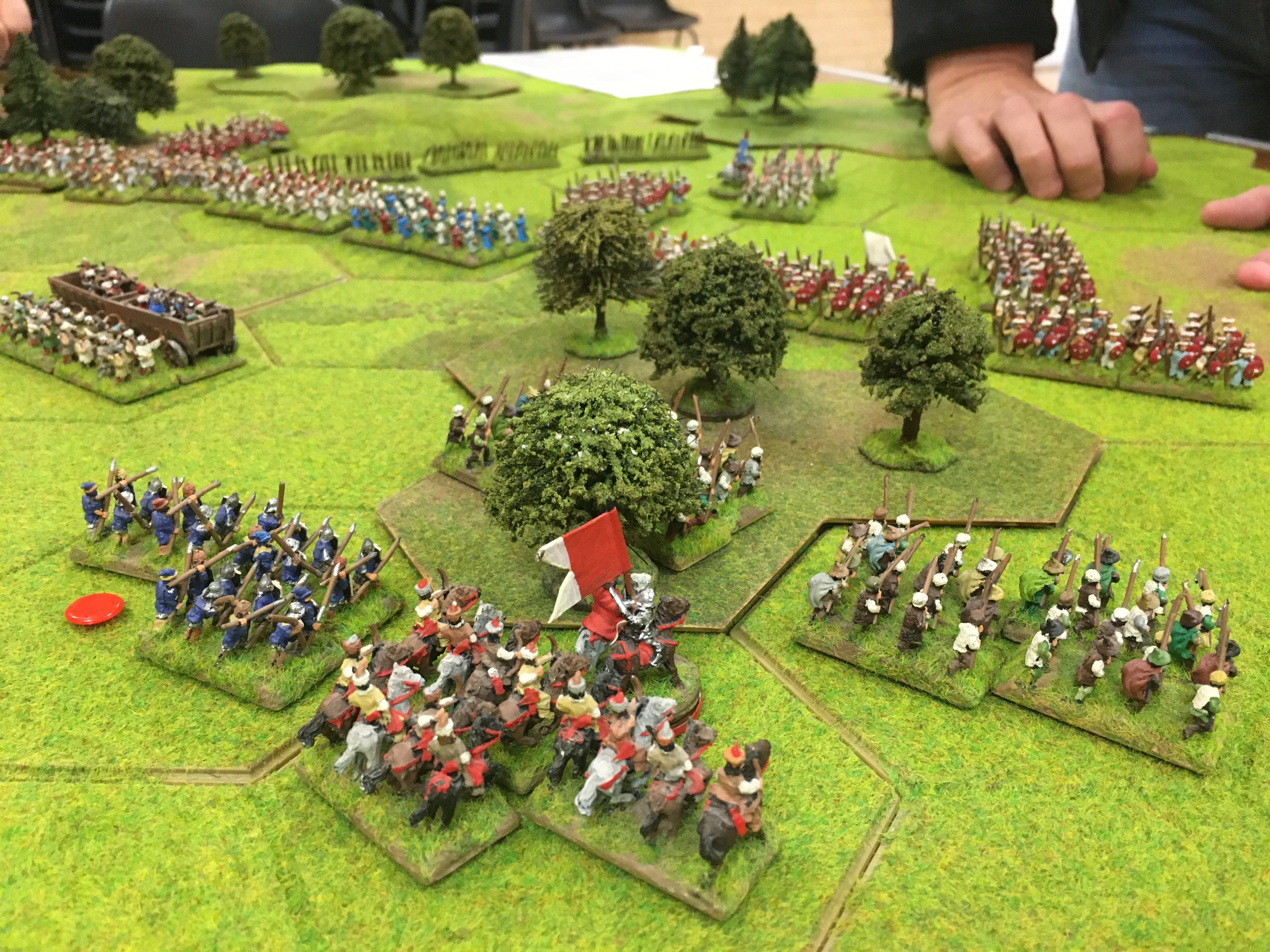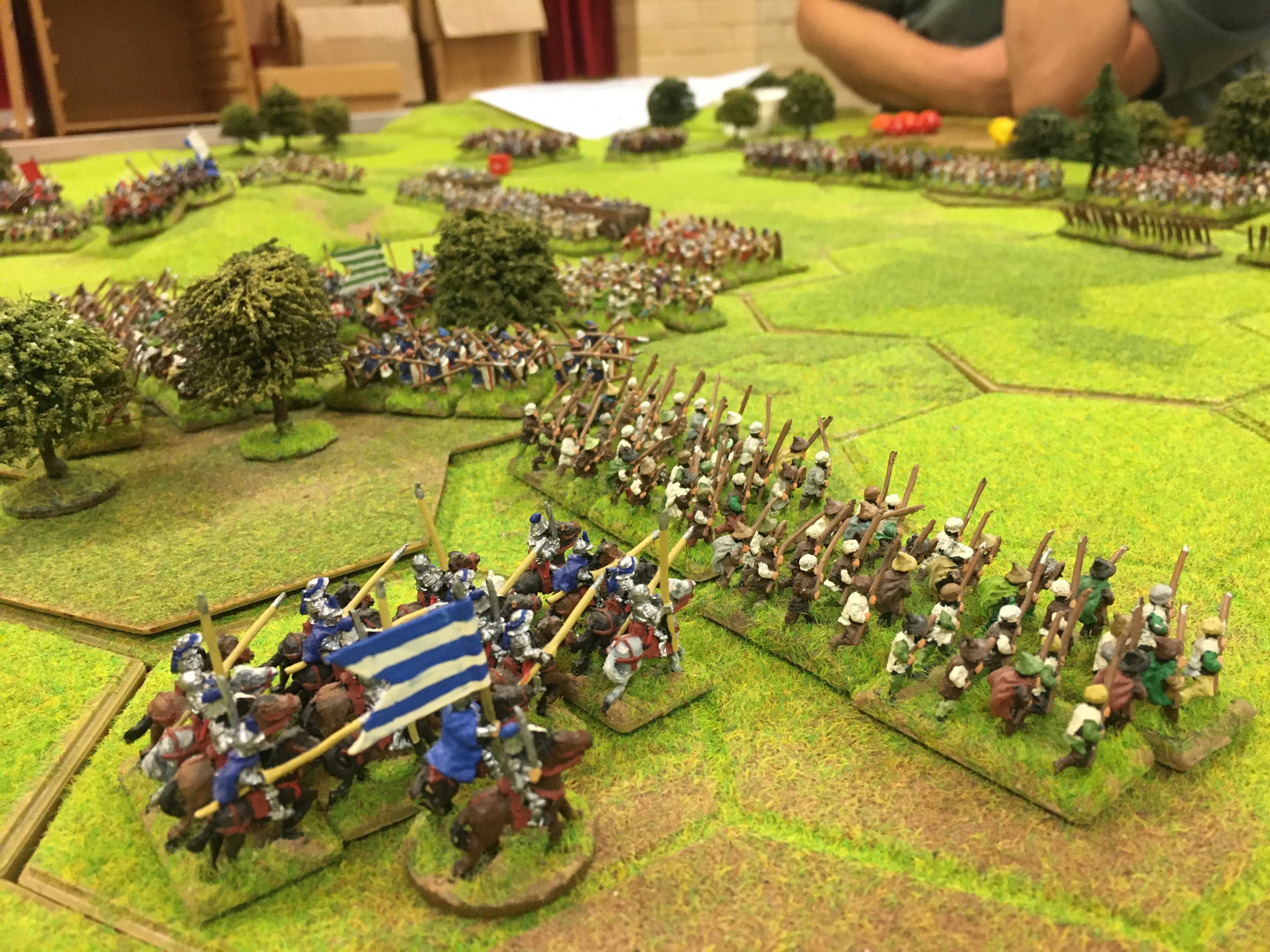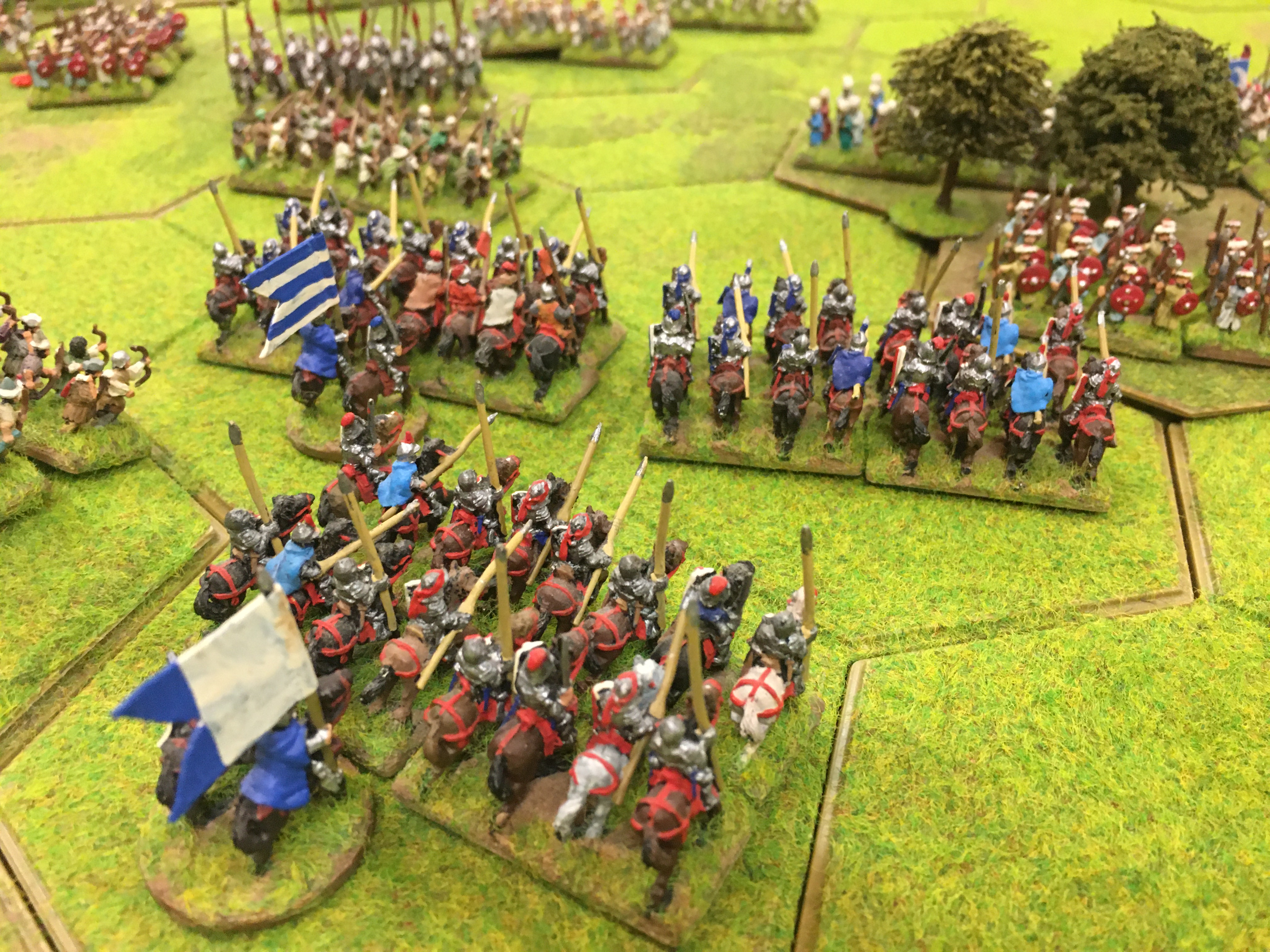 With the Ottoman infantry now in possession of the right hand wood the 3 remaining Hungarian heavy cavalry couldn’t get through the mass of disrupted Hungarian peasants and archers in the middle. Also, my archers missed a tactical move because they were out of command and control range of a general. As a result the two armies effectively bounced off each other and reformed in two diagonal lines across the table. I’m sure that in real life they would be snarling at each other in utter frustration! All players realised that despite herculean efforts from both sides that the Hungarians and Ottomans had pummeled each other into a draw once again.
