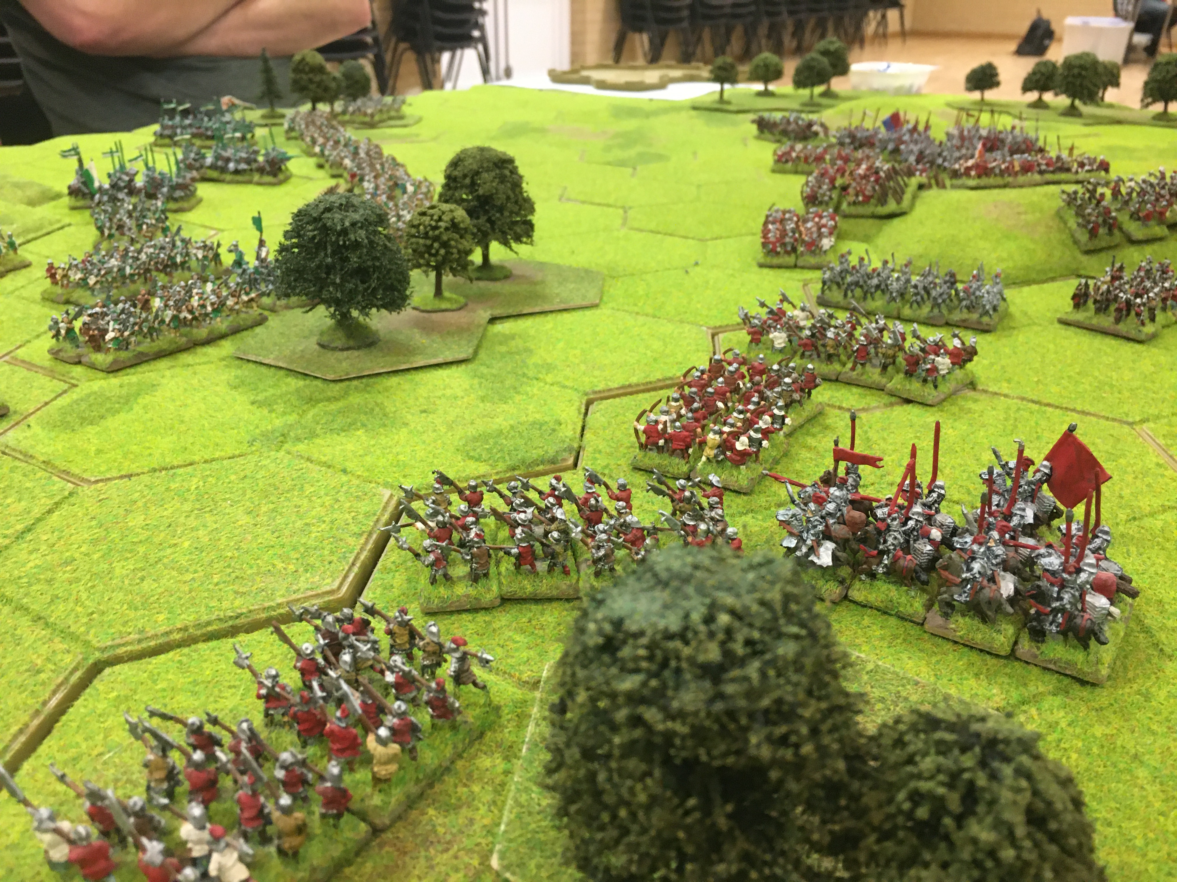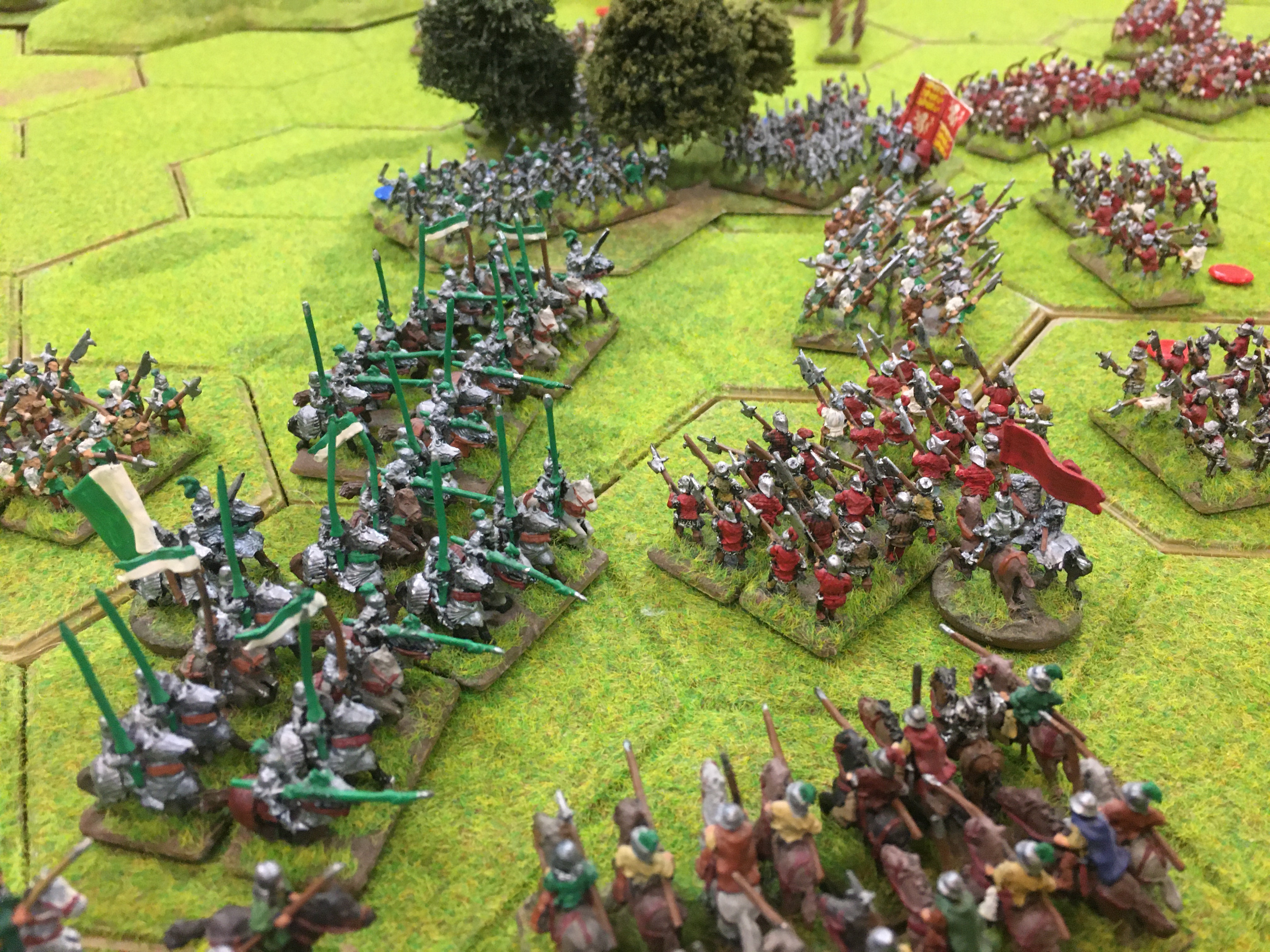 Tony positioned all but one of our mounted men-at-arms units behind our Lancastrian longbow and the threat of a charge made Chris cautious and he halted his advance and his longbow planted stakes. However, Tim through caution to the wind and charged his infantry and cavalry towards the central wood and my extreme left wing. In response to Tim’s attack I could either pull back into a strong defensive line or meet him head-on. I chose the latter!