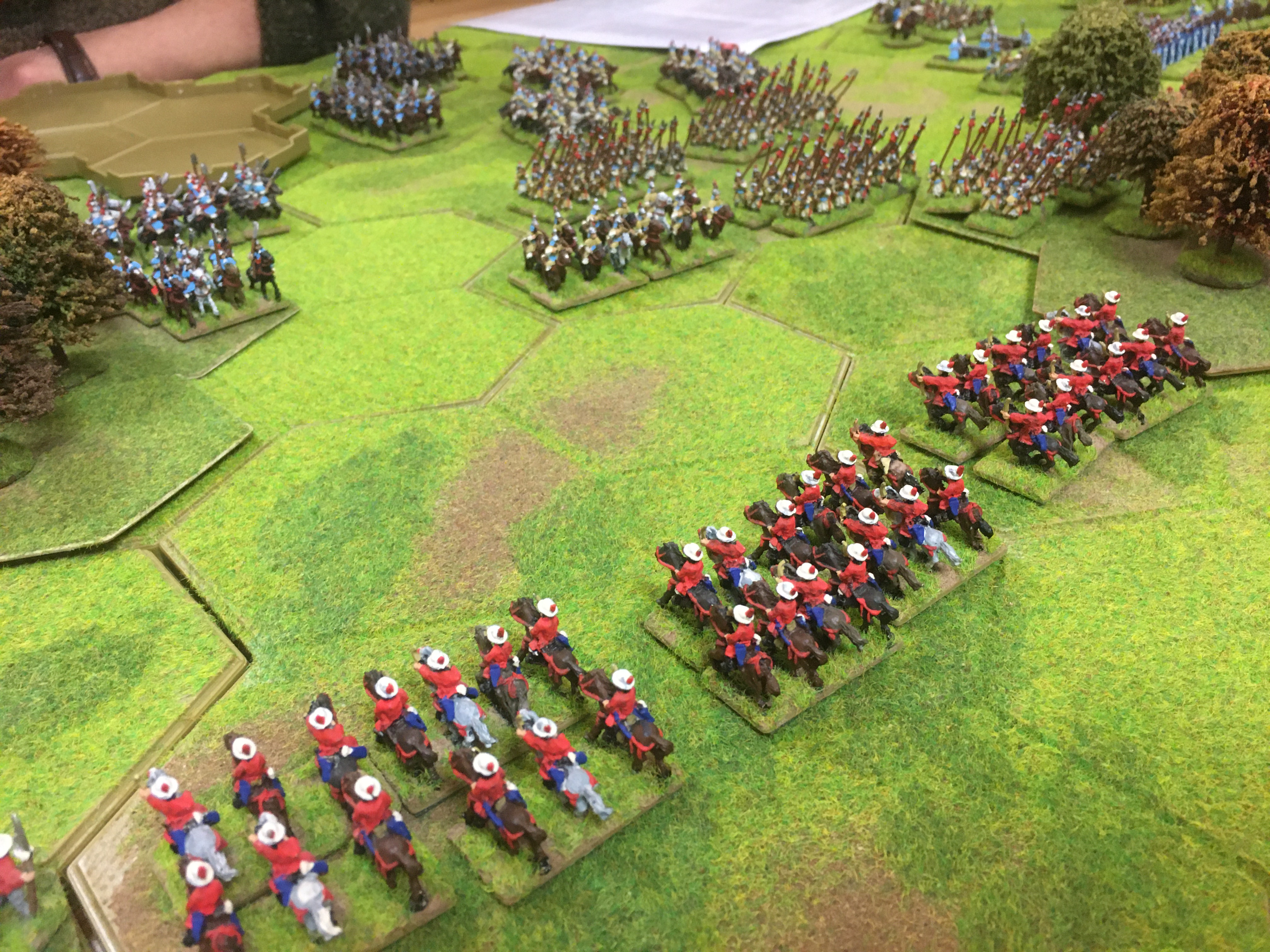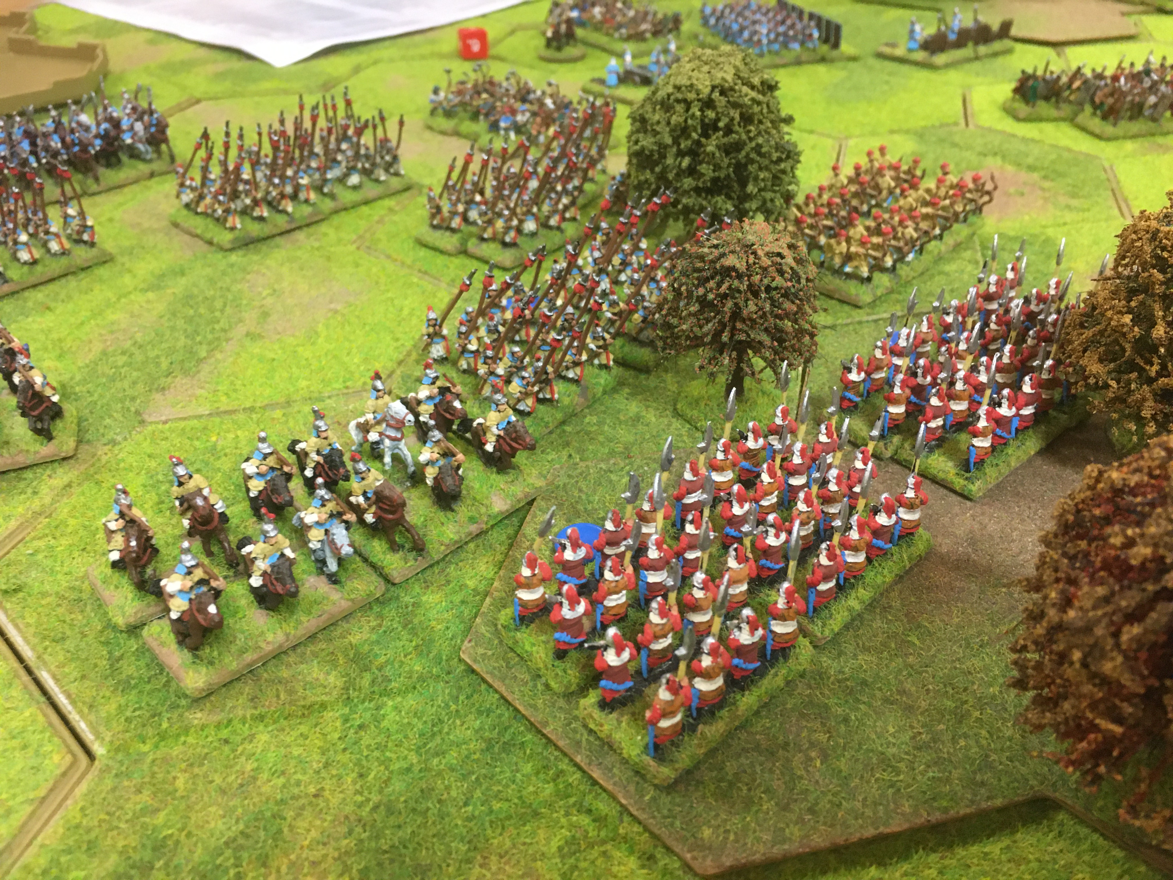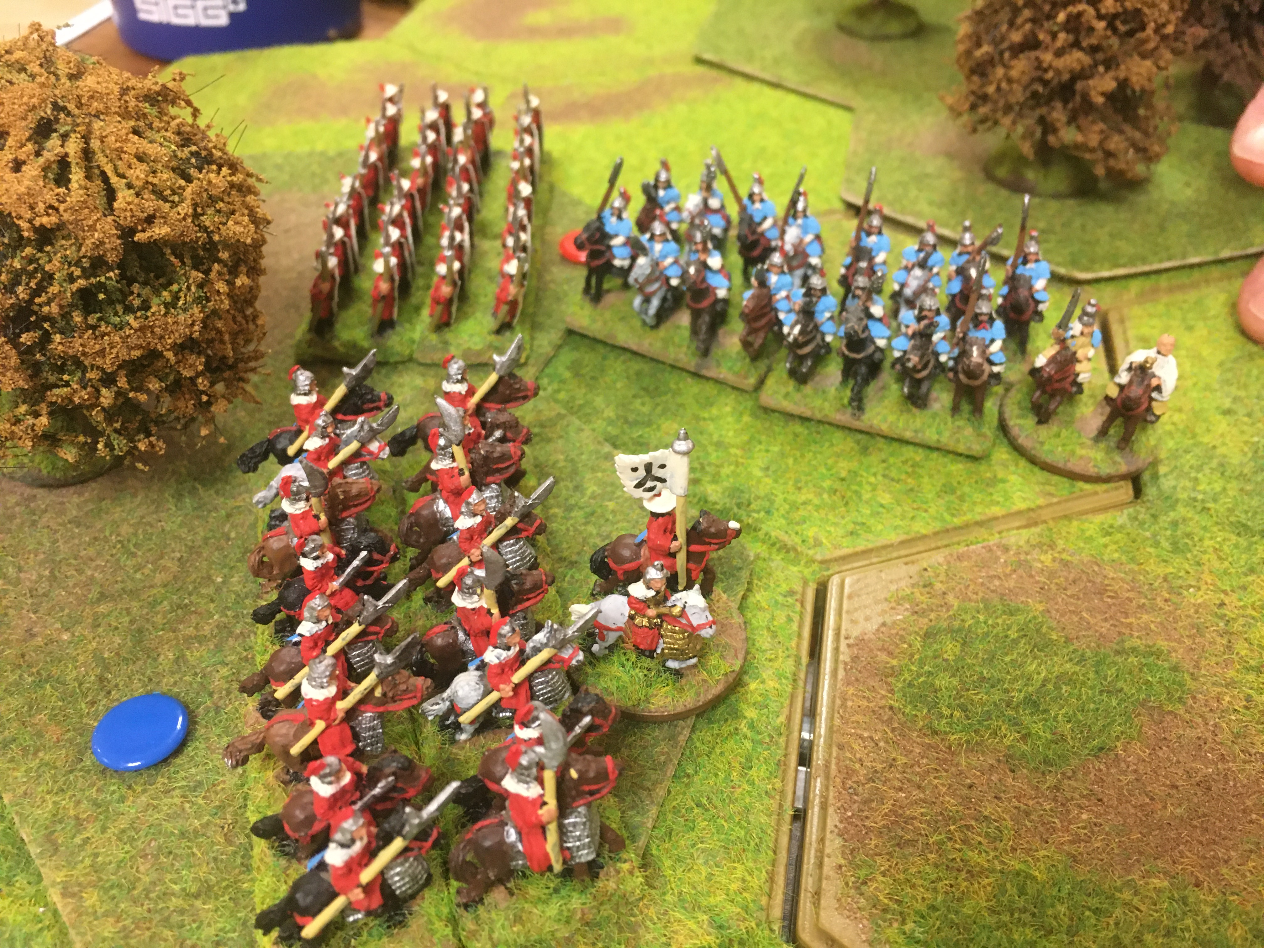 The Koreans deployed first and my Chinese won the dice roll for first move which I used to close the distance towards the woods. This was a deliberate attempt to close down the movement options of the excellent Korean cavalry. The light and heavy Korean cavalry units were all deployed on the forested side of the table. This I convinced myself was a ploy to pull my cavalry to the left so that the Koreans could switch their cavalry across behind the centre to the other wing into the more cavalry friendly open ground.