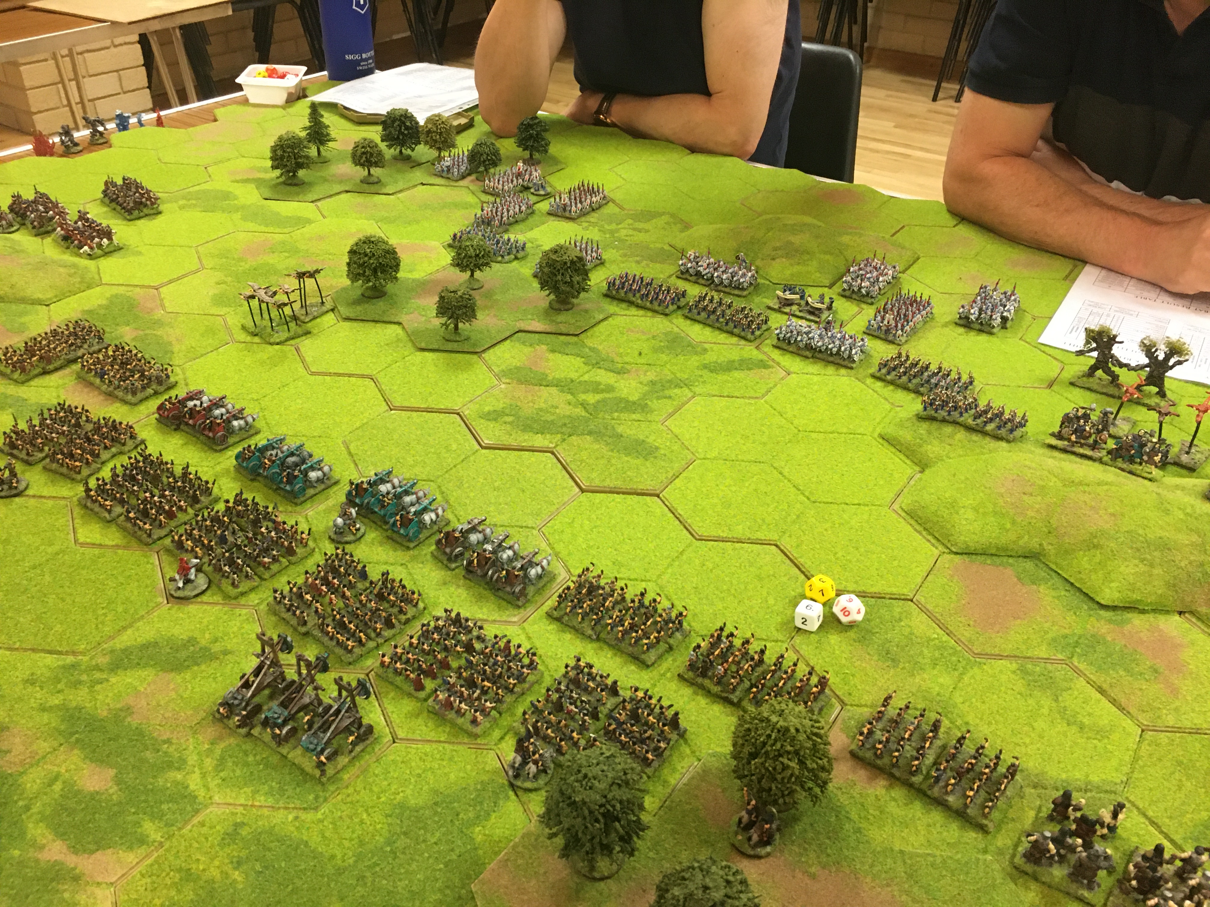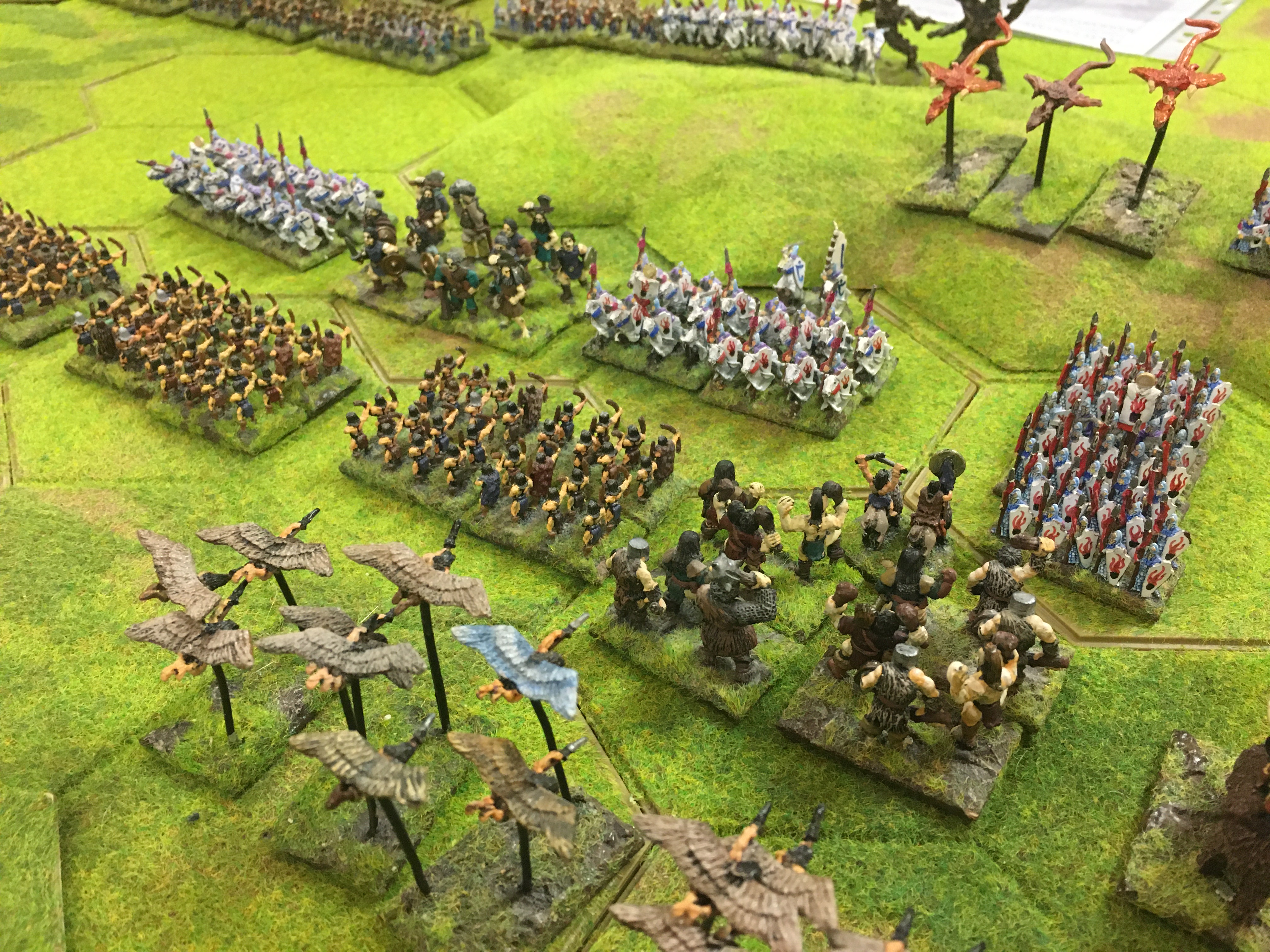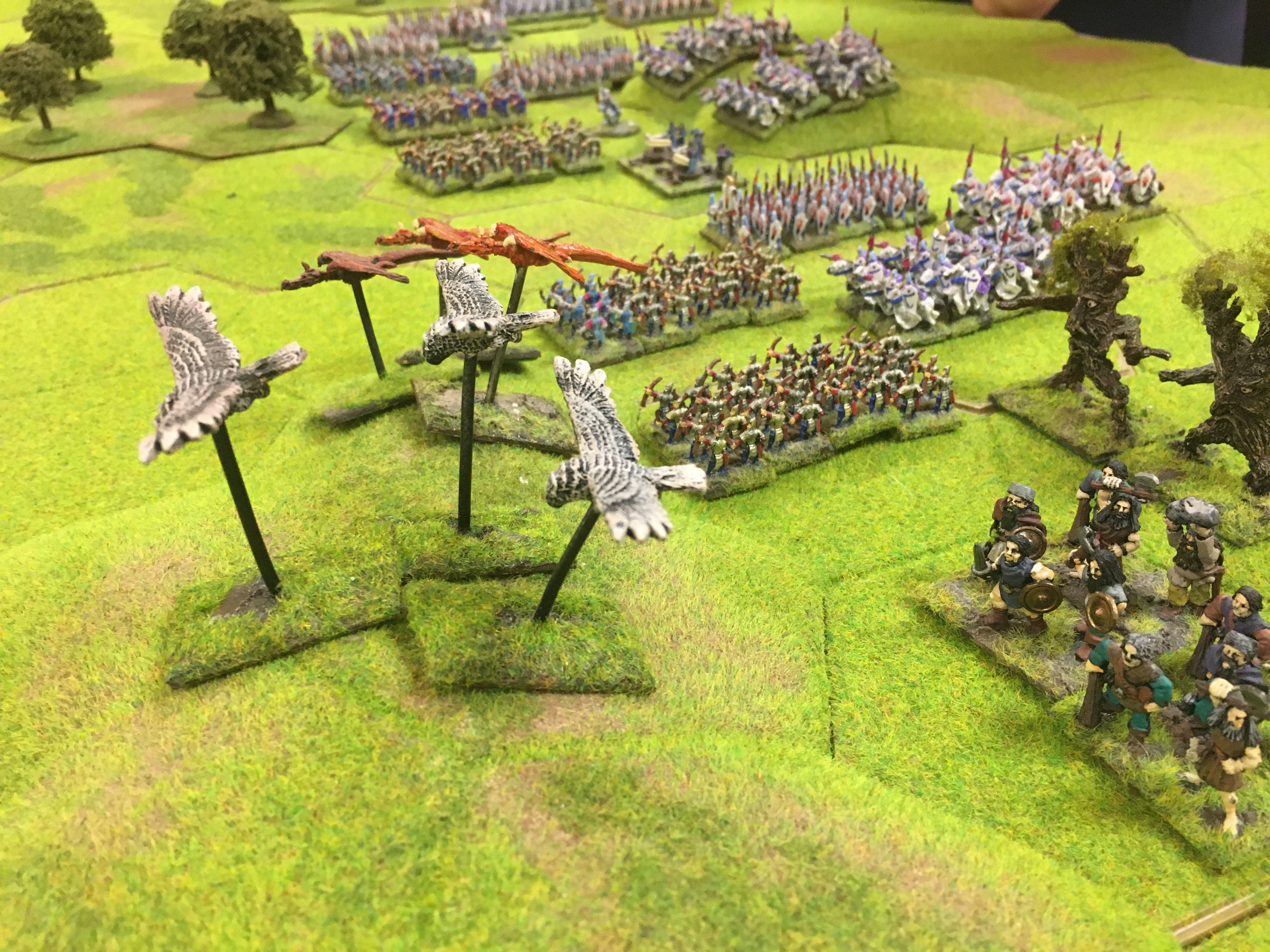 Tony had generalship of the Barbarian left and I the right, and so my units were primarily engaged with Chris’s and his with Tim’s with plenty of cross-over in the middle. Chris used his eagles, dragons and giants to attack my units of warriors, mammoths and giants on the extreme right of our line. Things went pear shaped quickly for my barbarians, and my giants and mammoth units were soon dispatched to the casualty tray after a very brief appearance on the table. Meanwhile, in the centre and left, Tony and Tim had so far played a more ‘cat and mouse’ game with neither committing large numbers into an attack. Instead the incompetent wizards continued to fail to evoke anything in the gap between the armies.