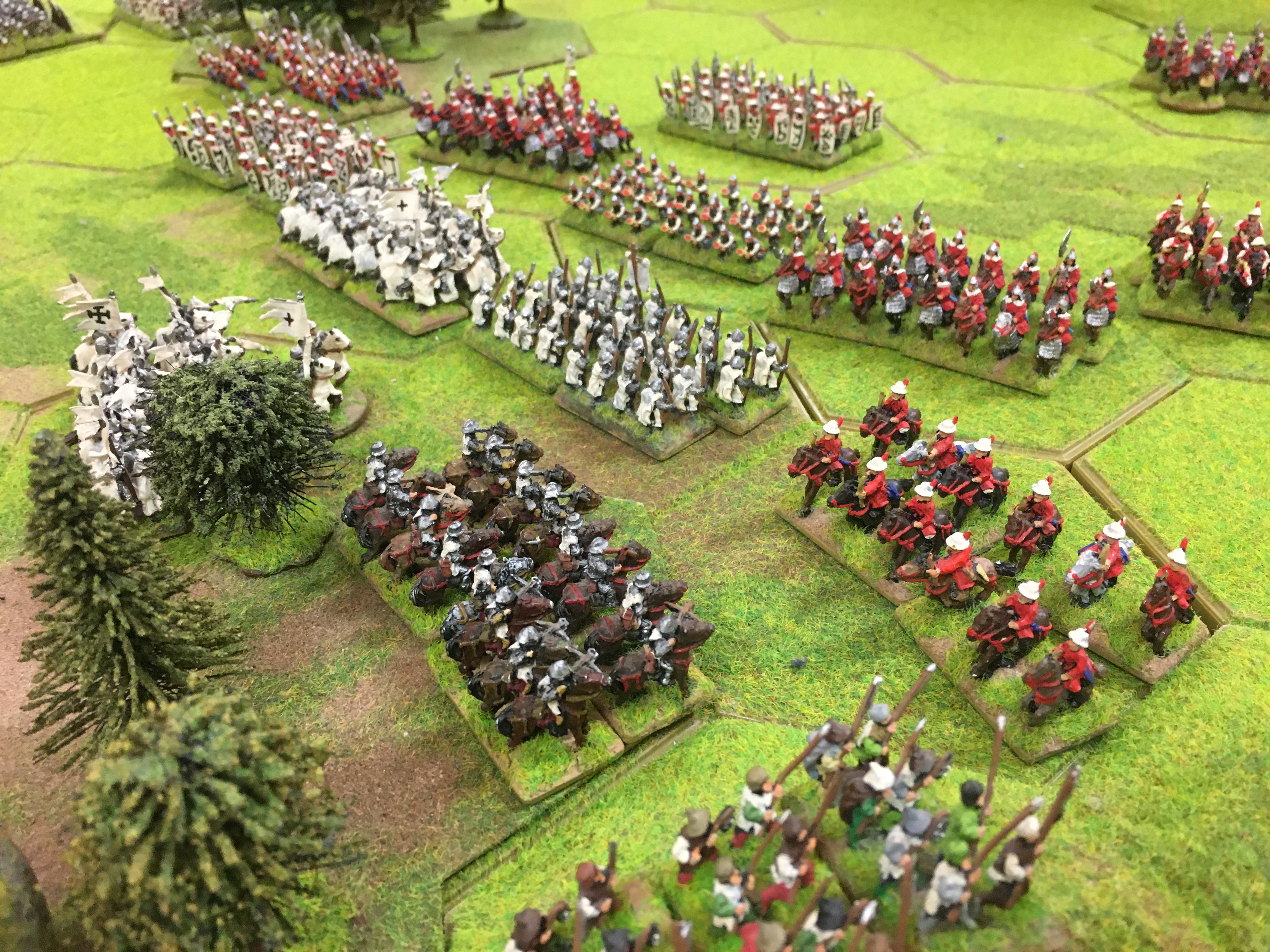 The Chinese gained the central 3 hex wood and pushed the victorious units beyond and into combat with the Teutonic Knights waiting behind. This committed the Teutonic Knights into combat and prevented the mass charge. The knights made their presence felt but were now fighting towards and getting caught by Chinese infantry in the 3 hex woodland.