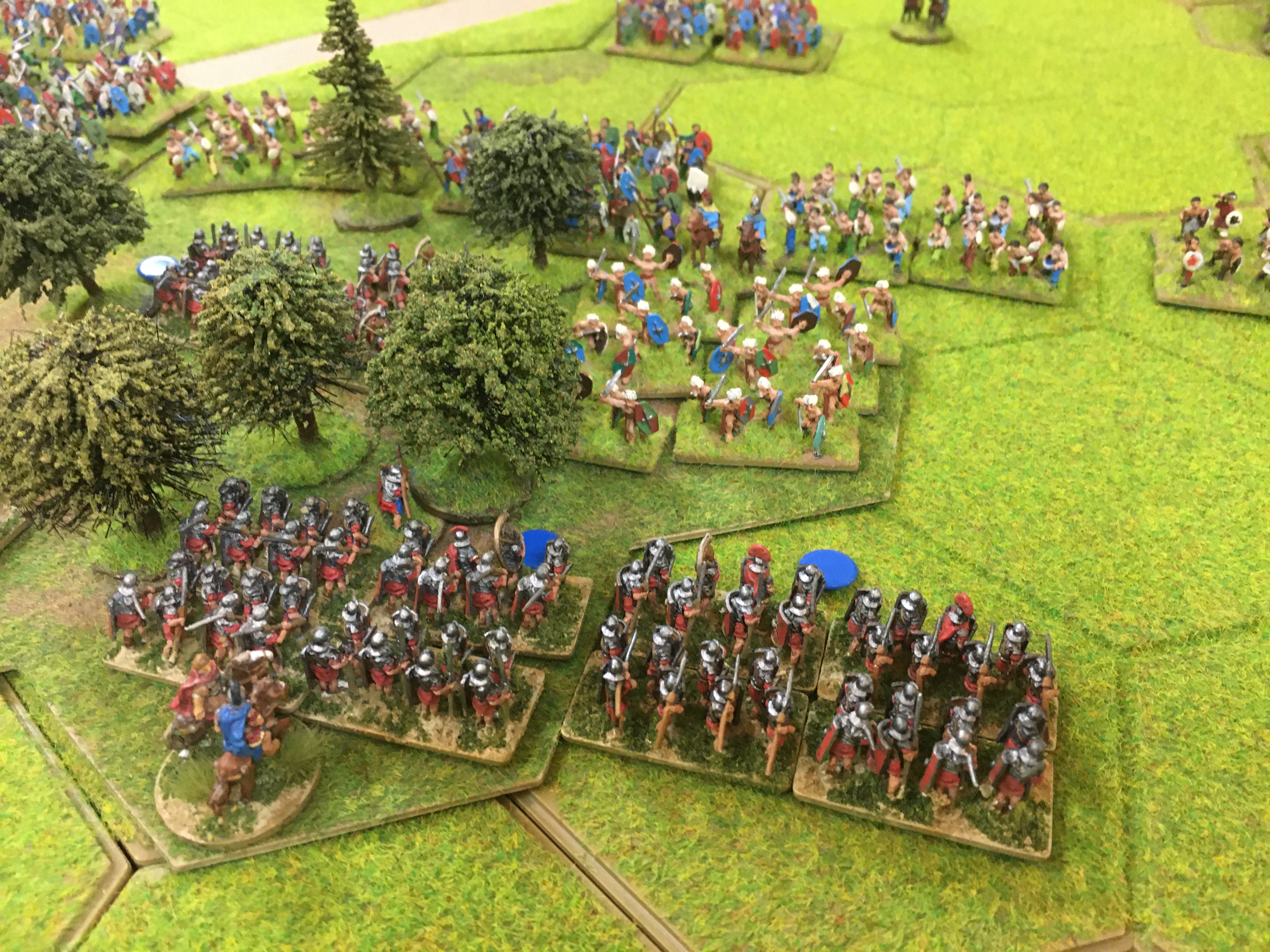 On the opposite wing the massed hordes of British warriors were lined up facing my 3 units of auxiliary bowmen and spears, only the lurking Roman cavalry behind would offer any real deterrent against a sudden mass charge. The small central woodland adjacent to the road was the point of the first British assault lead by Gaisatai fanatics and a general. This started a local battle that would last for more than an hour and suck in reserves from both sides. By sacrificing my legionaries to an ordeal of a slow missile death, I had in fact prevented the Brits from fully exploiting their much greater mobility. This enabled my Romans to go onto the attack on the other wing without the fear of being completely surrounded by British chariots and light horse etc. These were all fully engaged elsewhere!
