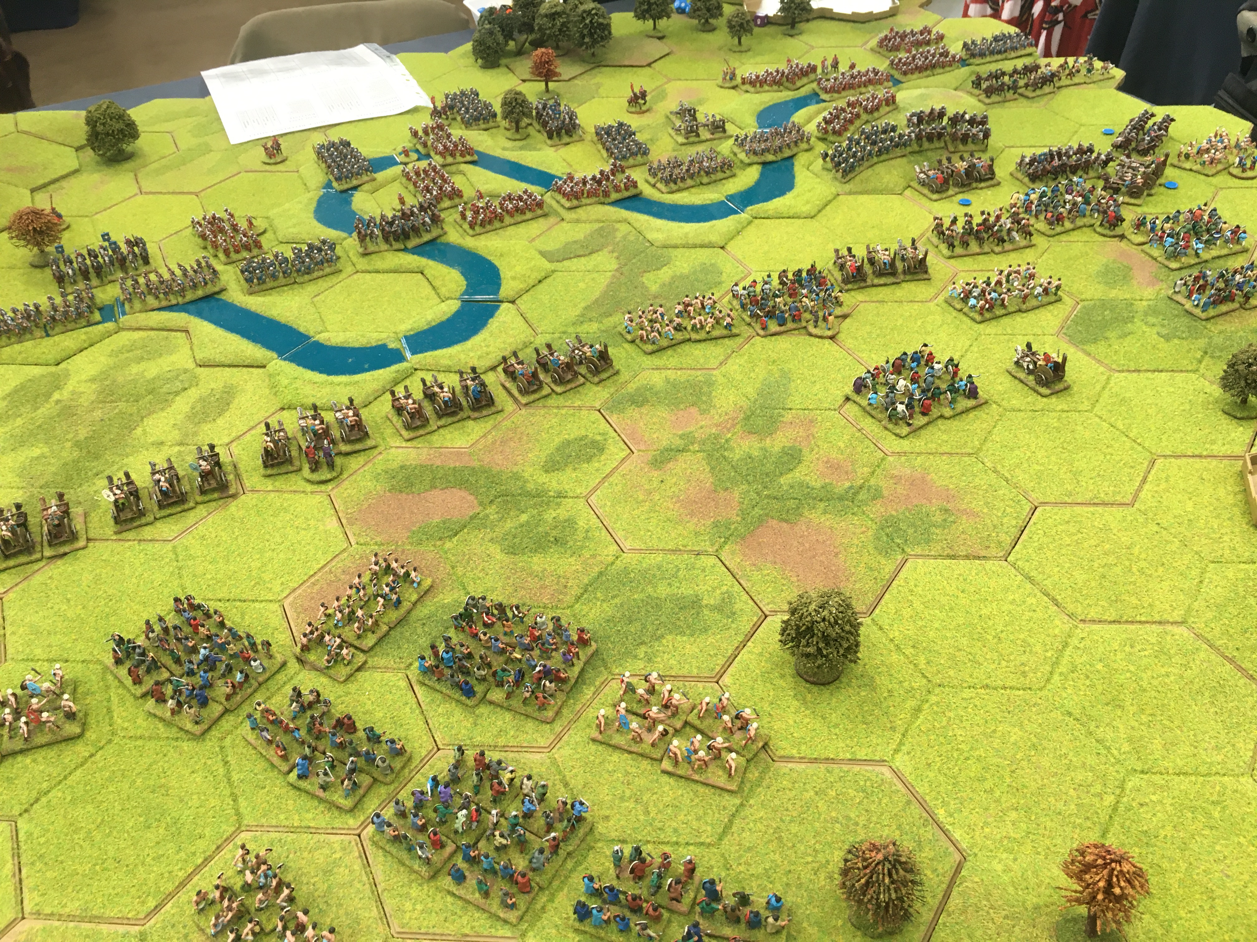 Roman cavalry and light cavalry units then crossed the extreme northern part of the river which forced the British to commit light cavalry units to the opposite end of the table. This was soon followed by the start of a general Roman advance to and across the river across the width of the board. By mid afternoon despite a number of local successes the battle of attrition was being decidedly won by the Romans. Gradually more and more legionary units established their lines along the west bank of the Medway.